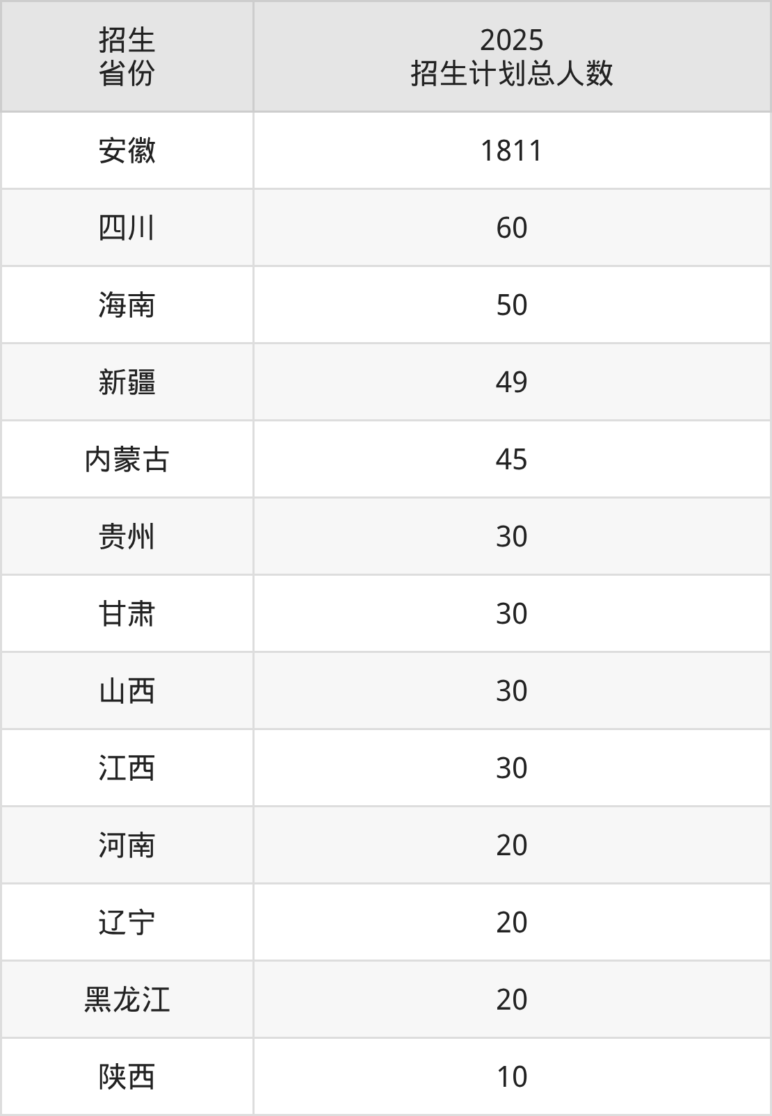 2025年安徽中医药高等专科学校面向全国13个省市开展专科招生;招生专业共21个,招生人数共2205人。2025年在安徽省招生计划总人数是1811人,其中,安徽中医药高等专科学校在安徽省招生人数最多的是护理。安徽中医药高等专科学校在各省具体招生人数情况如下表。