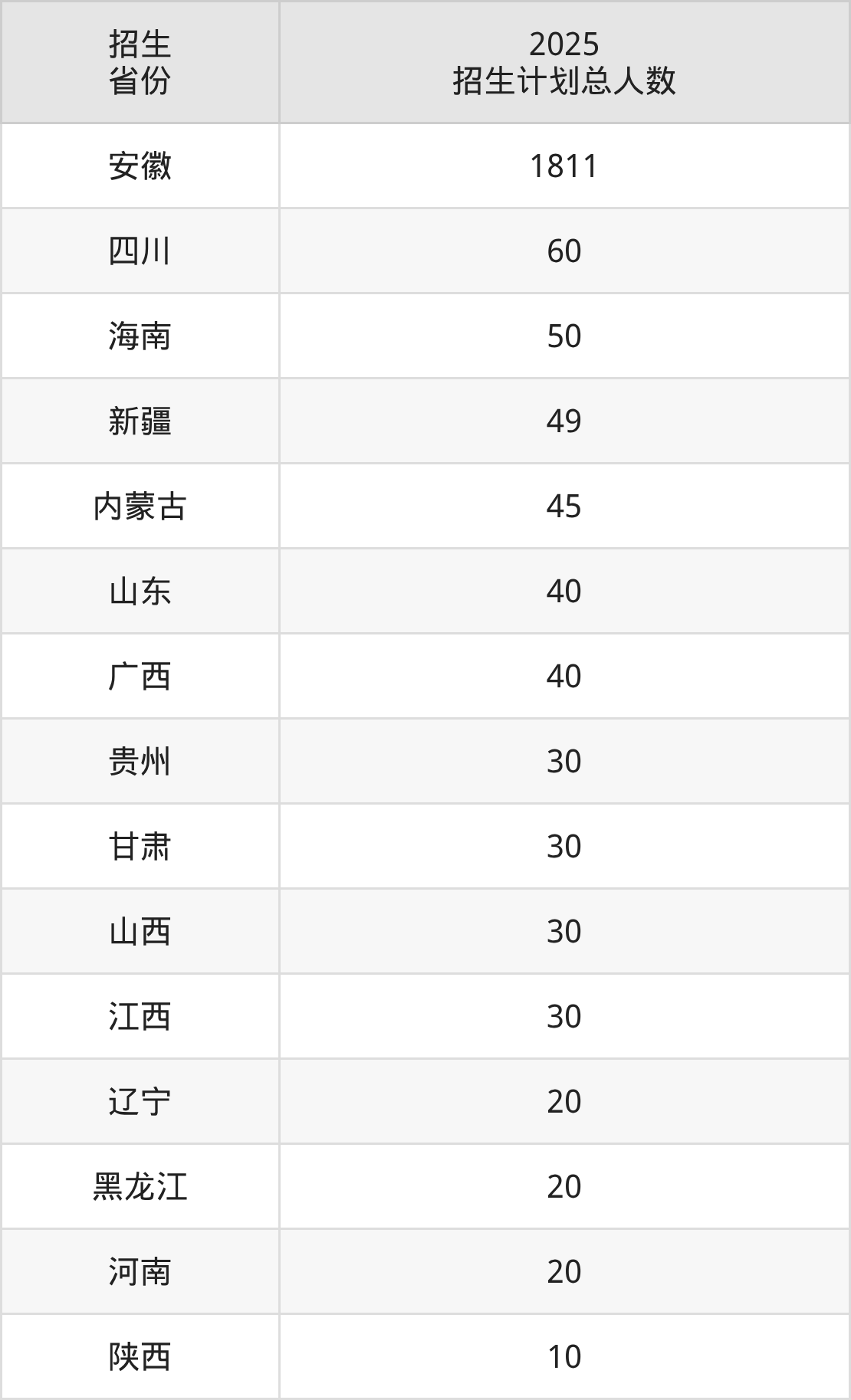 2025年安徽中医药高等专科学校面向全国15个省市开展专科招生;招生专业共22个,招生人数共2285人。2025年在安徽省招生计划总人数是1811人,其中,安徽中医药高等专科学校在安徽省招生人数最多的是护理。安徽中医药高等专科学校在各省具体招生人数情况如下表。