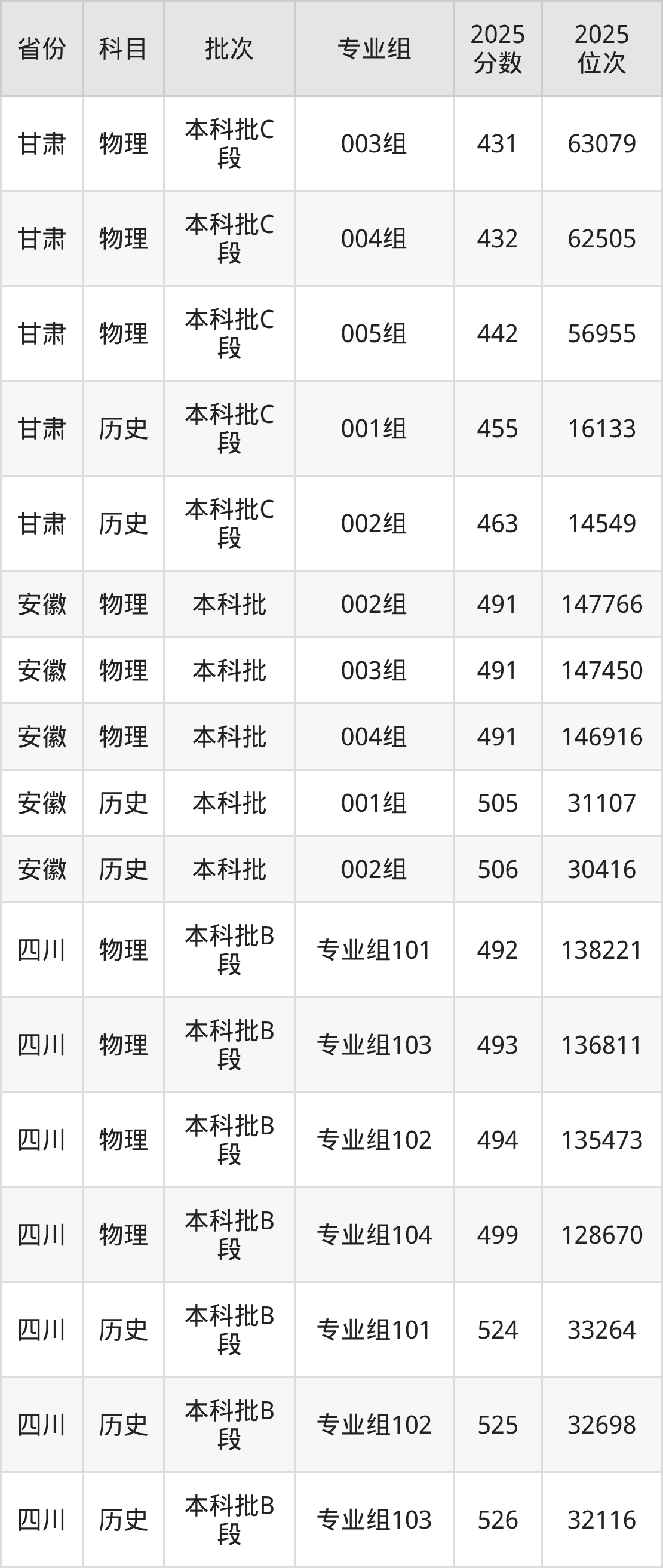 普通类本科物理类最低491分,本科历史类最低505分