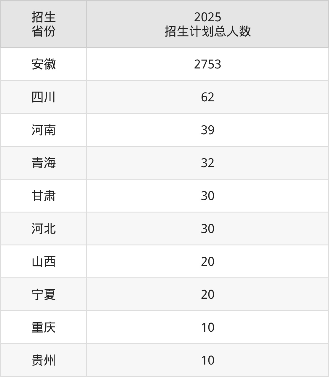 2025年亳州学院面向全国10个省市开展本科招生;招生专业共30个,招生人数共3006人。2025年在安徽省招生计划总人数是2753人,其中,亳州学院在安徽省招生人数最多的是汉语言文学。亳州学院在各省具体招生人数情况如下表。