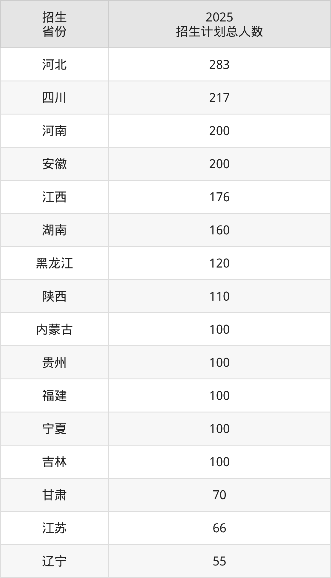 2025年石家庄邮电职业技术学院面向全国23个省市开展专科招生;招生专业共17个,招生人数共2390人。2025年在河北省招生计划总人数是283人,其中,石家庄邮电职业技术学院在河北省招生人数最多的是财务会计类。石家庄邮电职业技术学院在各省具体招生人数情况如下表。