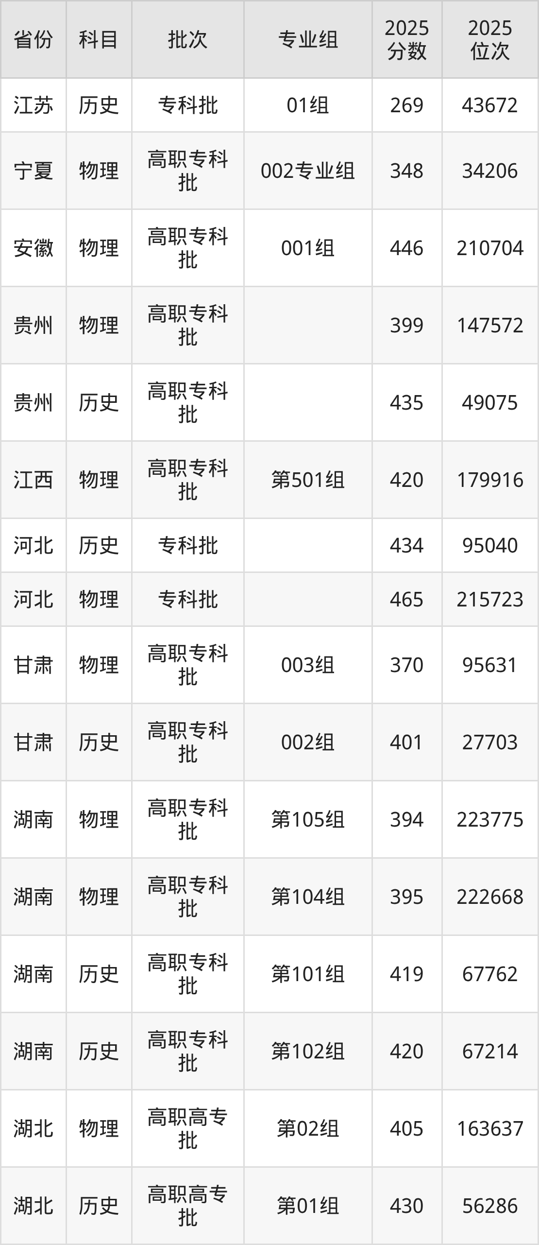 2025年长沙职业技术学院全国录取分数线是269分到465分,录取最低在江苏历史类(01组)、录取最高在河北物理类。各省各专业组最低分具有差异,详情如下: