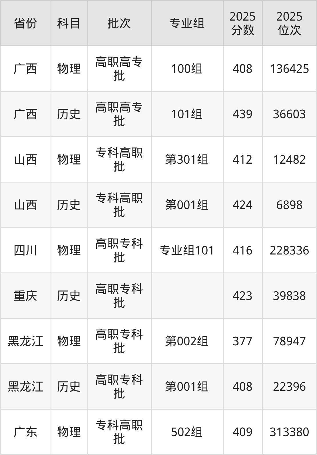 普通类专科物理类最低408分,专科历史类最低439分