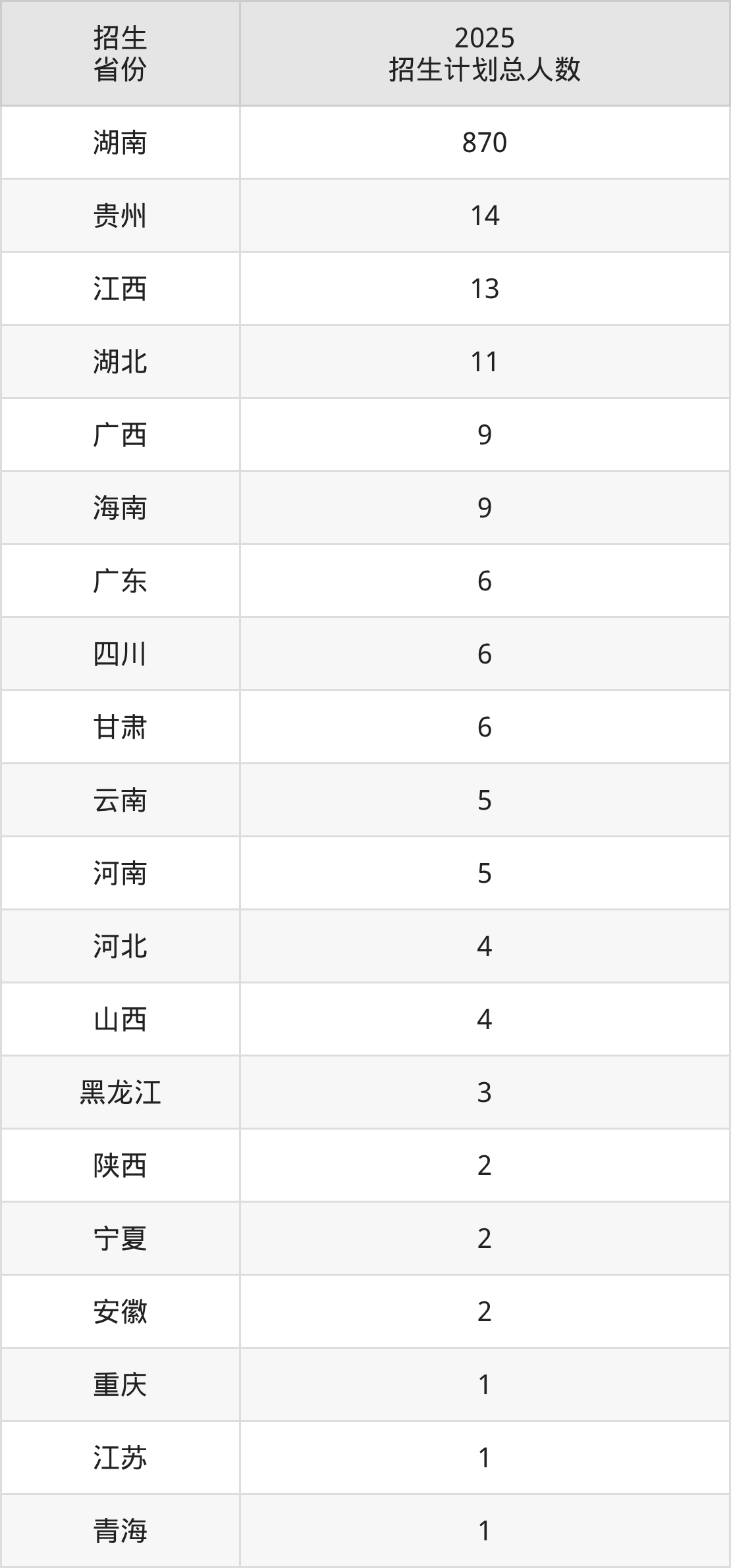 2025年长沙职业技术学院面向全国21个省市开展专科招生;招生专业共24个,招生人数共975人。2025年在湖南省招生计划总人数是870人,其中,长沙职业技术学院在湖南省招生人数最多的是特殊教育。长沙职业技术学院在各省具体招生人数情况如下表。