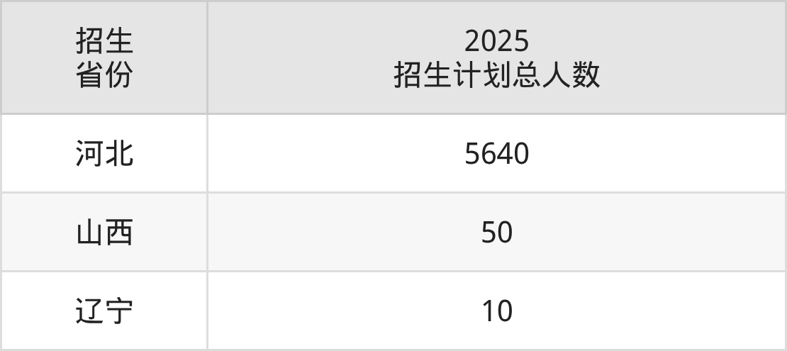 2025年石家庄经济职业学院面向全国3个省市开展专科招生;招生专业共47个,招生人数共5700人。2025年在河北省招生计划总人数是5640人,其中,石家庄经济职业学院在河北省招生人数最多的是护理。石家庄经济职业学院在各省具体招生人数情况如下表。