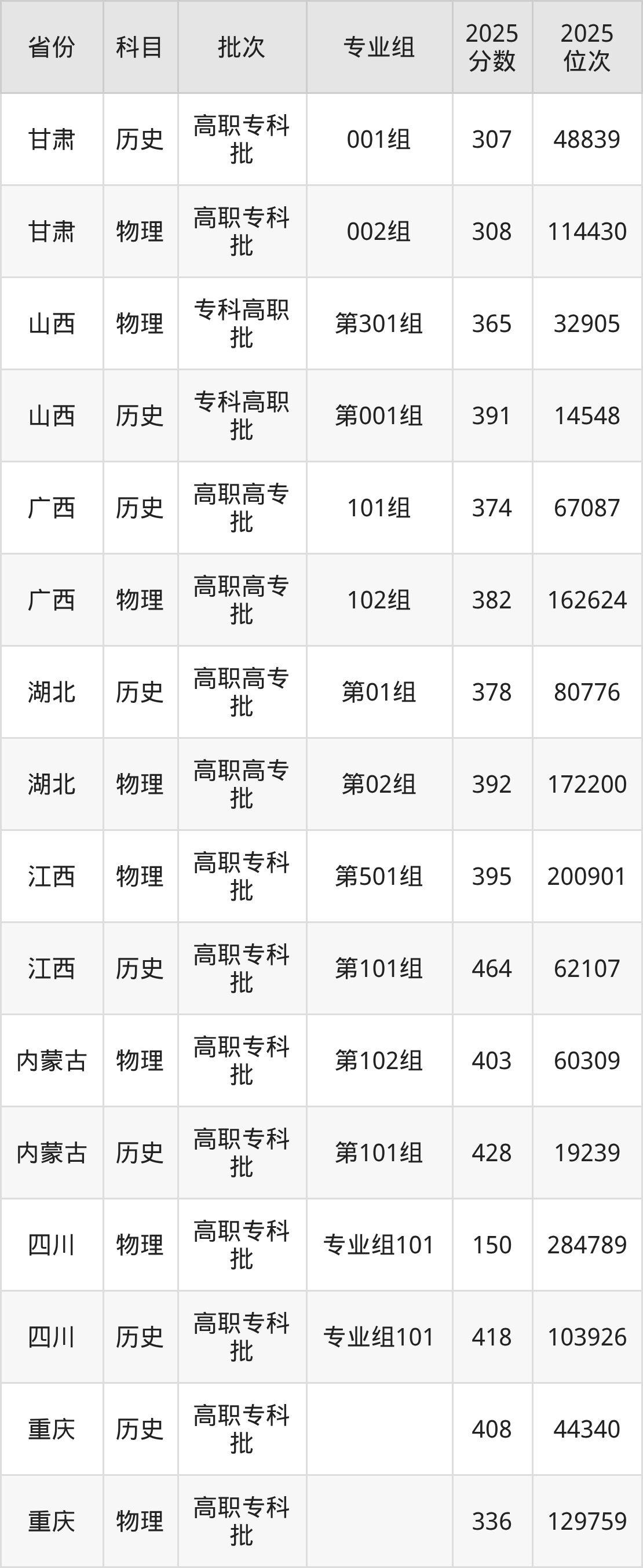 普通类专科物理类最低403分,专科历史类最低428分
