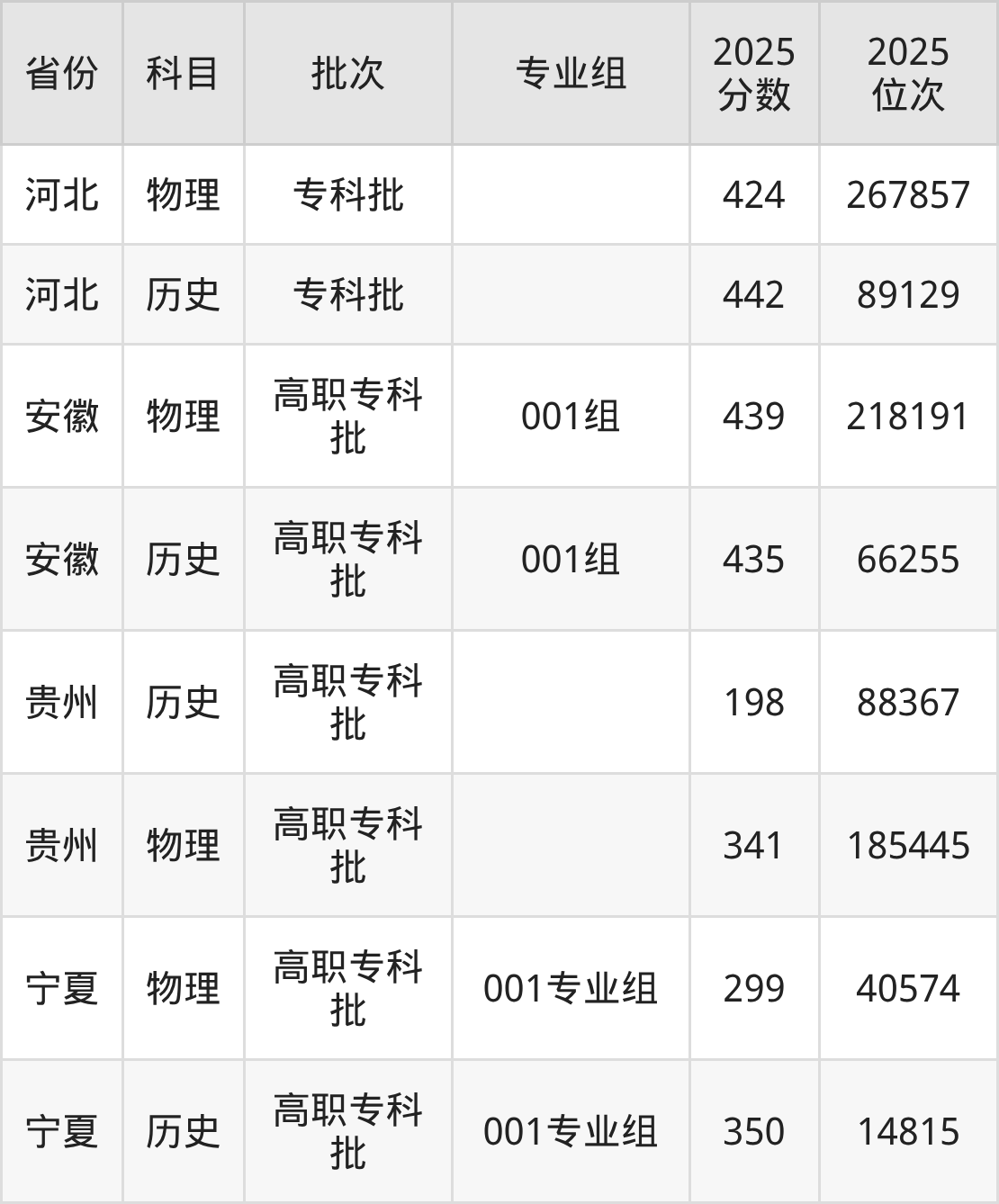 普通类专科物理类最低299分,专科历史类最低350分