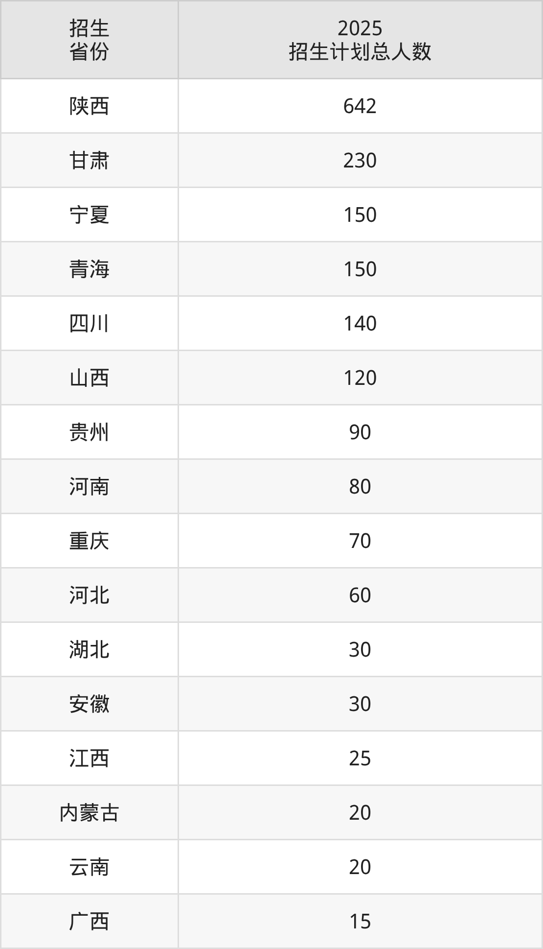 2025年西安医学高等专科学校面向全国16个省市开展专科招生;招生专业共14个,招生人数共1872人。2025年在陕西省招生计划总人数是642人,其中,西安医学高等专科学校在陕西省招生人数最多的是口腔医学。西安医学高等专科学校在各省具体招生人数情况如下表。