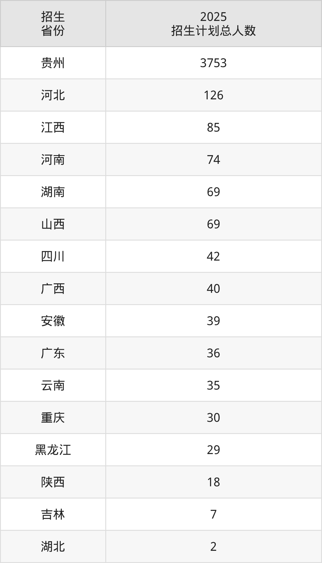 2025年贵州师范大学面向全国16个省市开展本科招生;招生专业共60个,招生人数共4454人。2025年在贵州省招生计划总人数是3753人,其中,贵州师范大学在贵州省招生人数最多的是数据科学与大数据技术。贵州师范大学在各省具体招生人数情况如下表。
