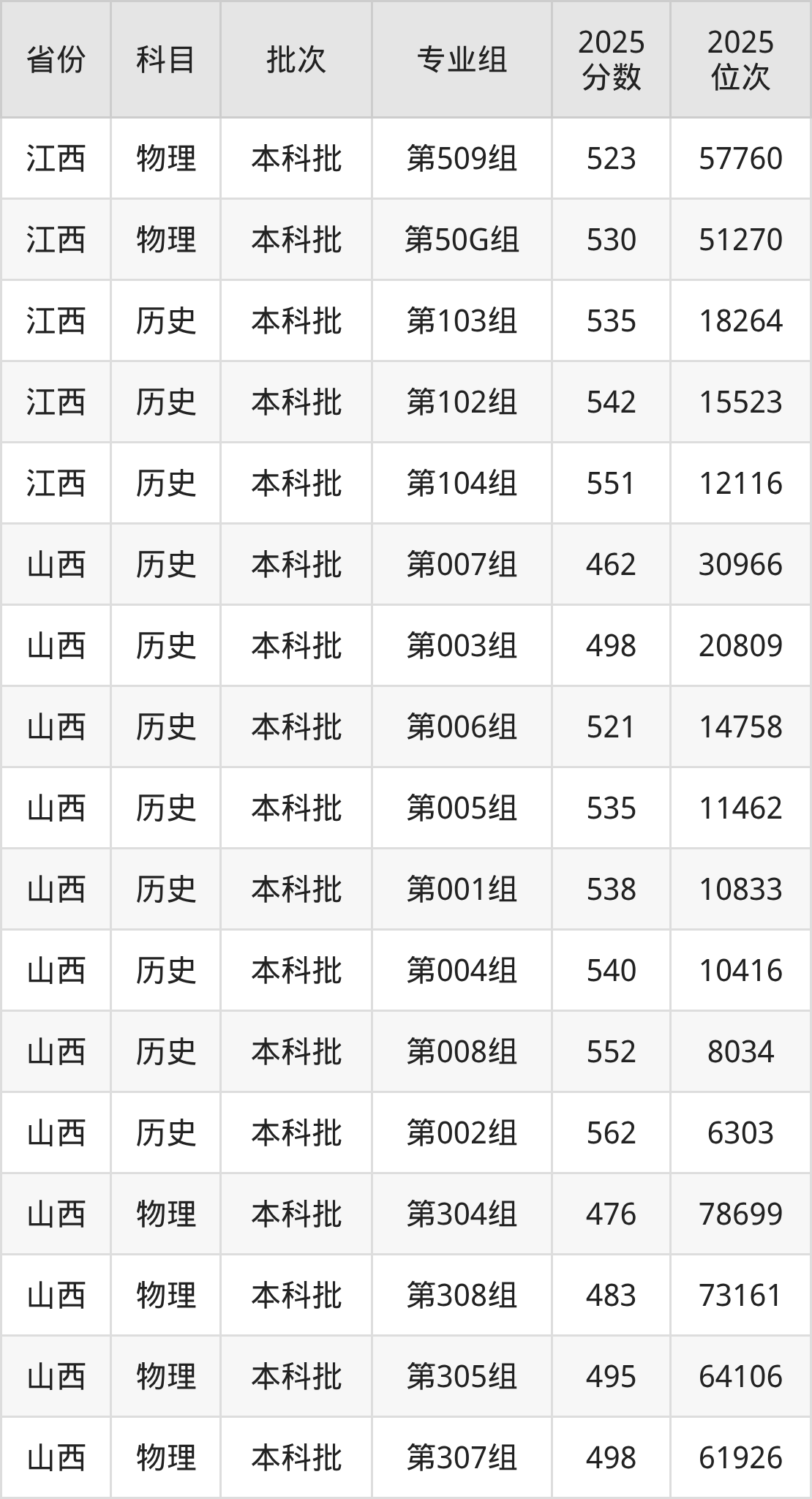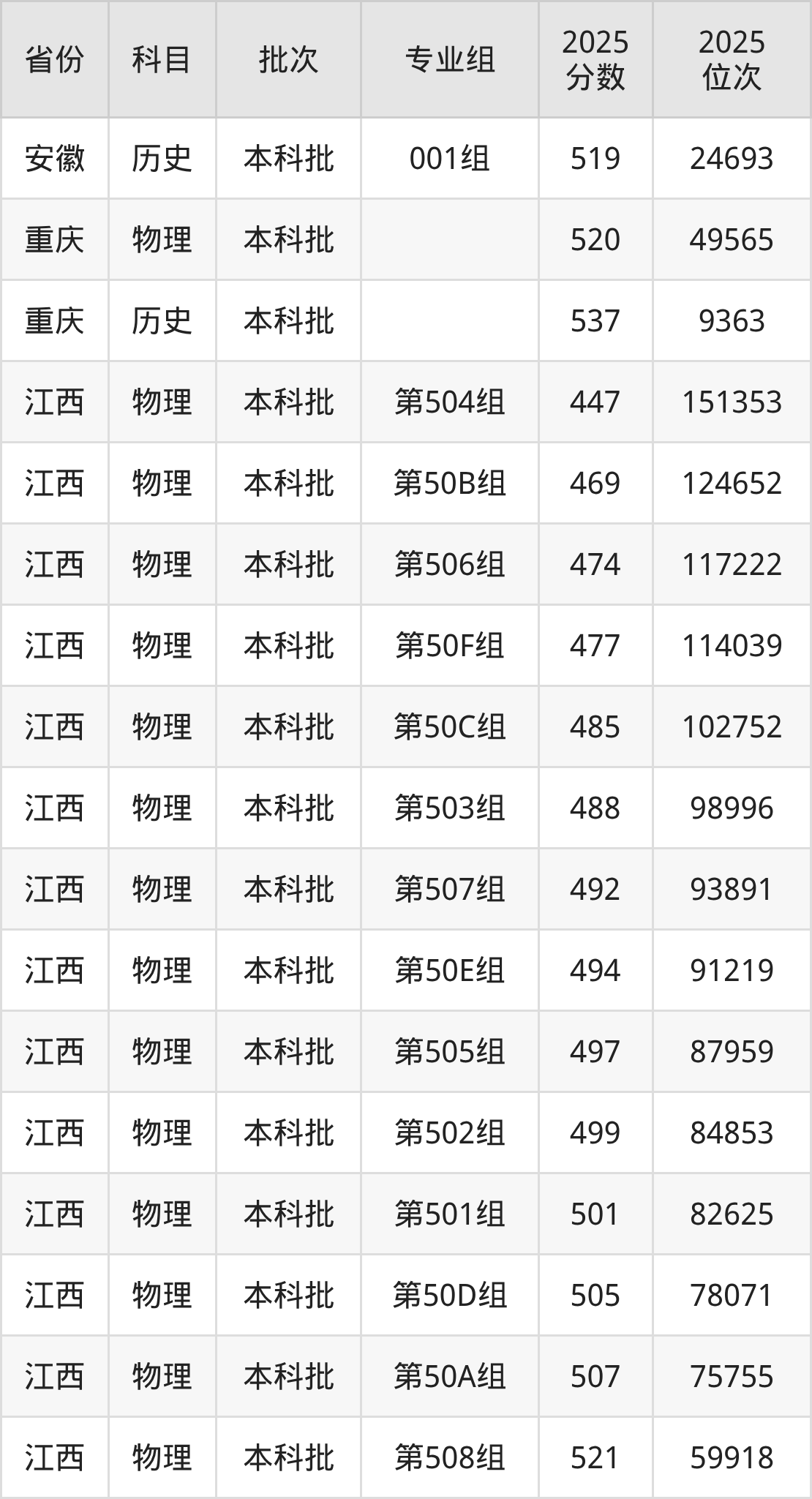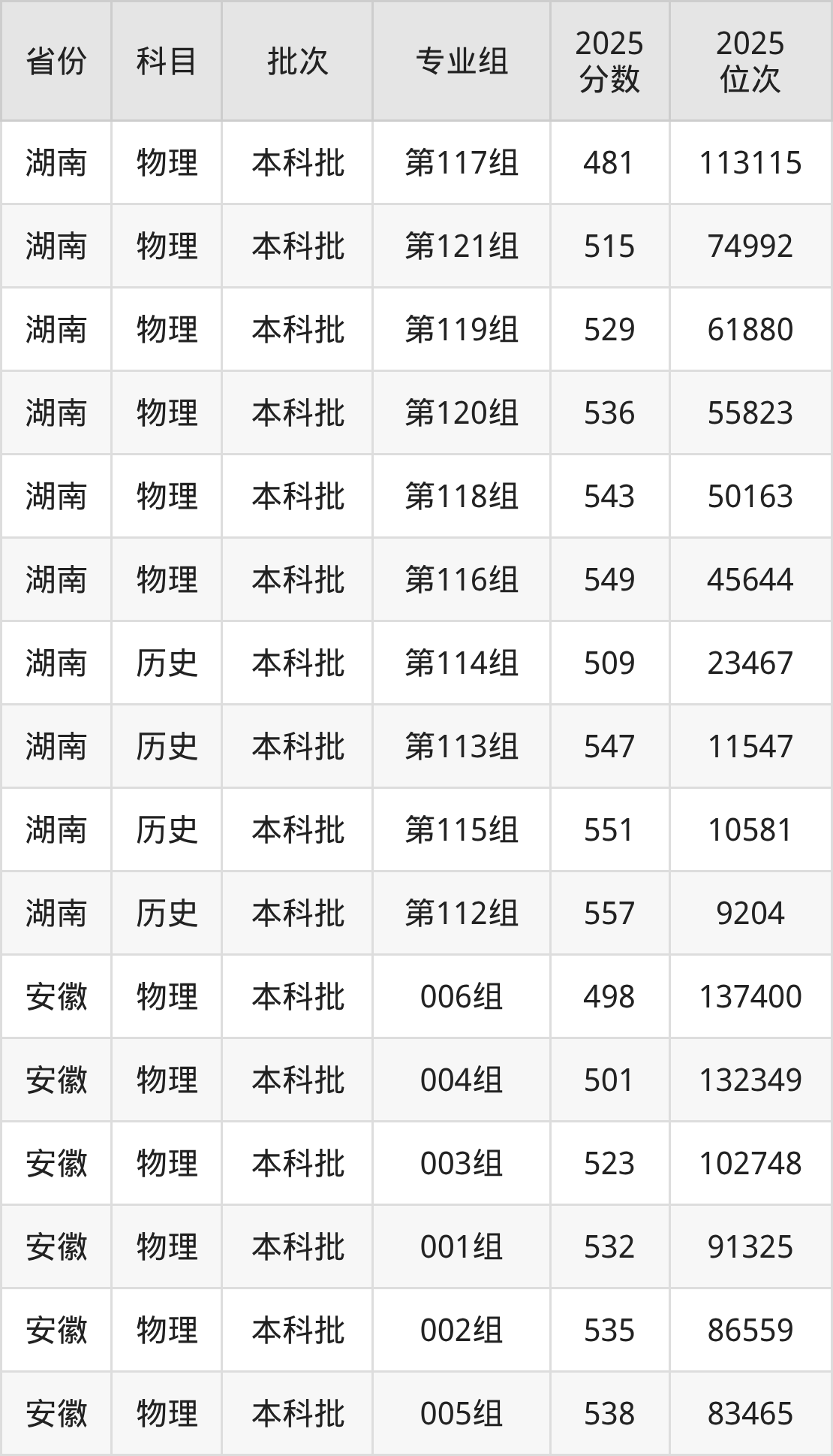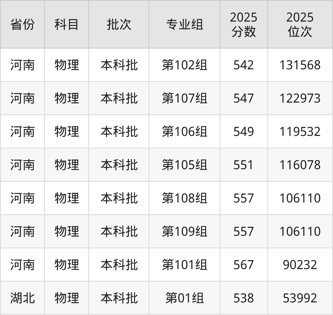 2025年在本科物理类进行招生,各专业组分数线详情如下: