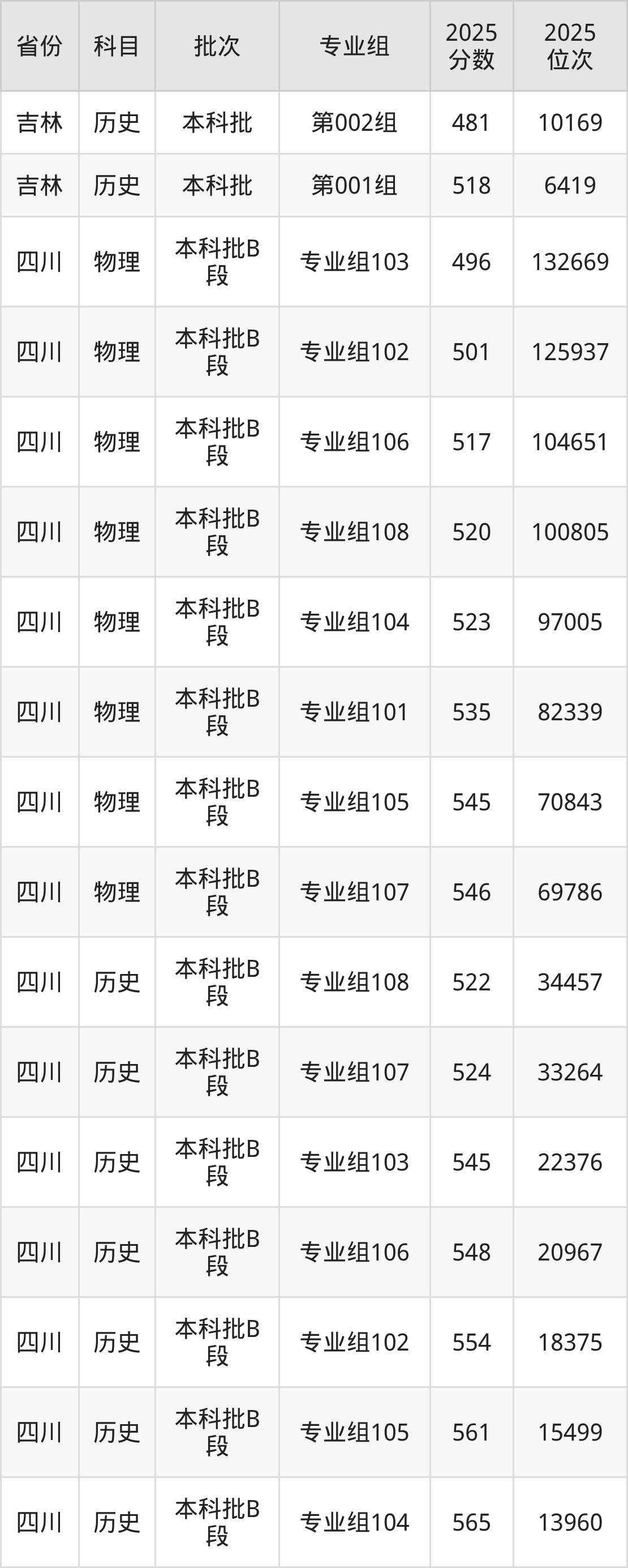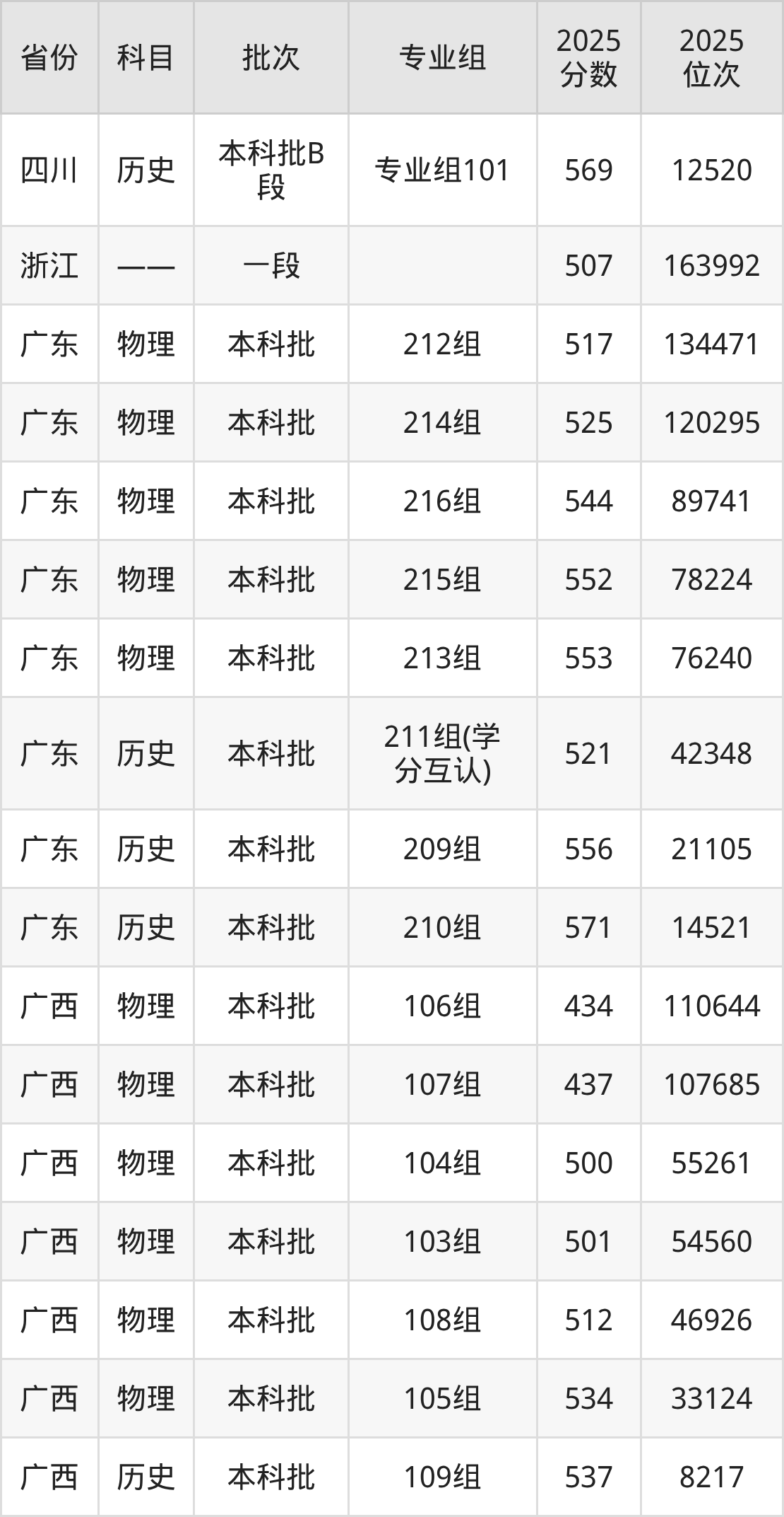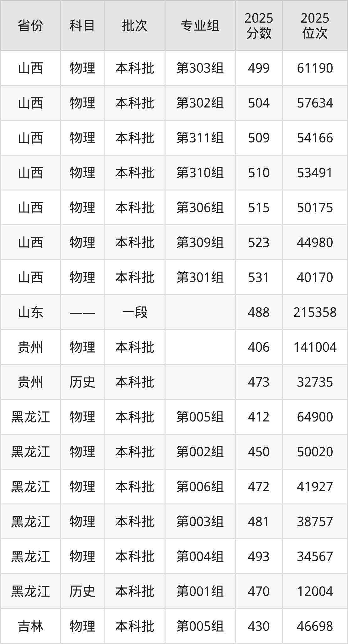 2025年在本科物理类进行招生,各专业组分数线详情如下: