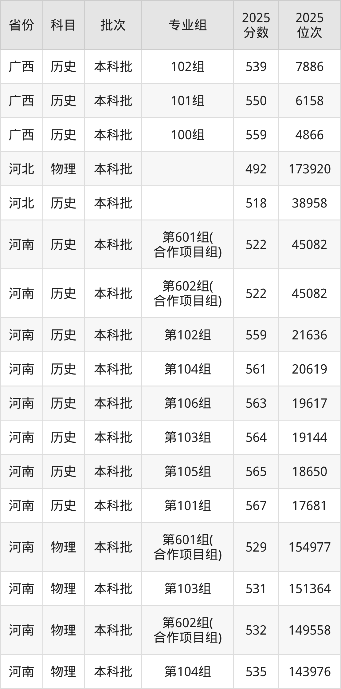 贵州师范大学第601组(合作项目组):2025年投档录取最低分为522分,录取最低位次为45082名。