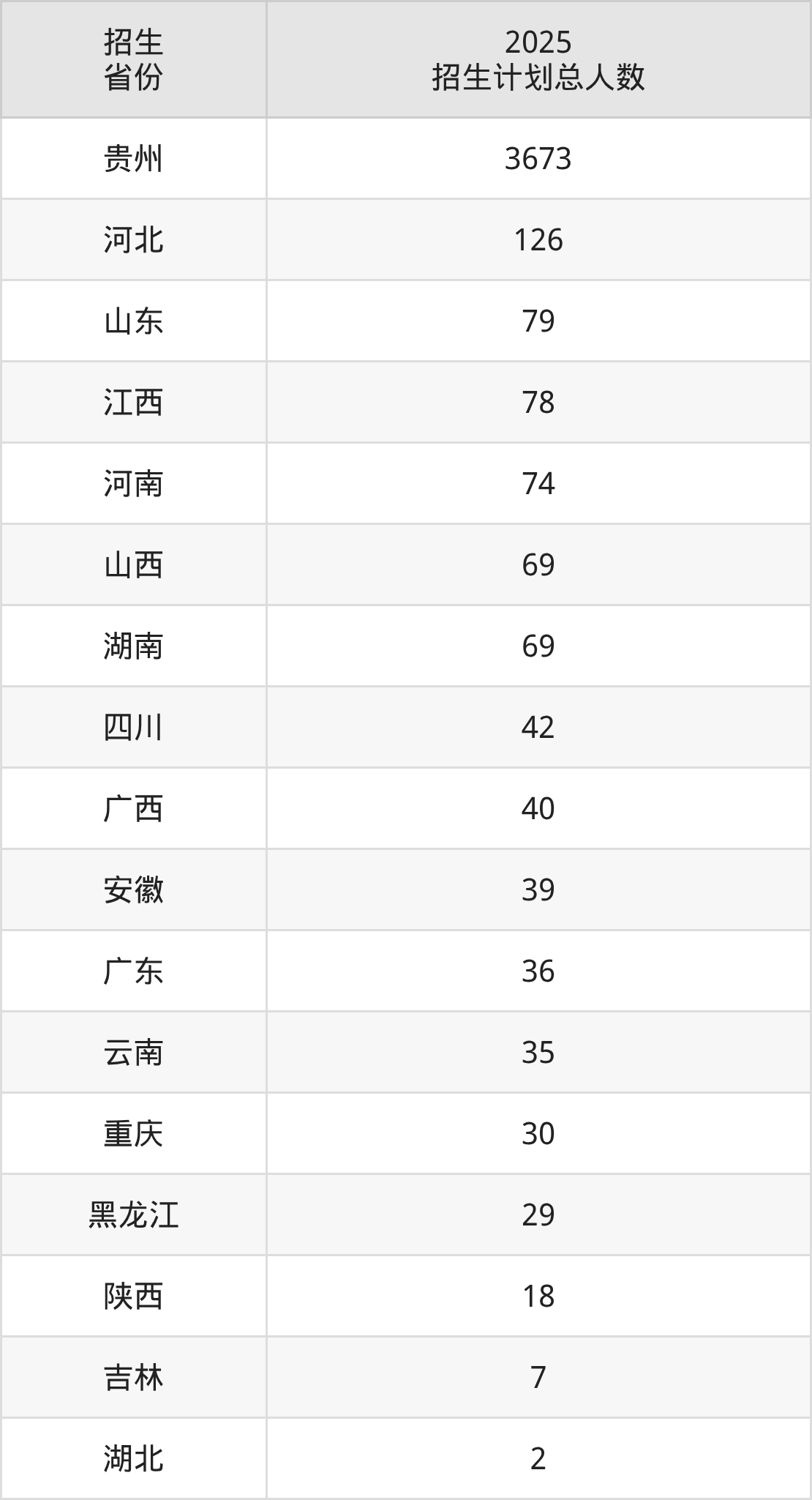 2025年贵州师范大学面向全国17个省市开展本科招生;招生专业共58个,招生人数共4446人。2025年在贵州省招生计划总人数是3673人,其中,贵州师范大学在贵州省招生人数最多的是数据科学与大数据技术。贵州师范大学在各省具体招生人数情况如下表。