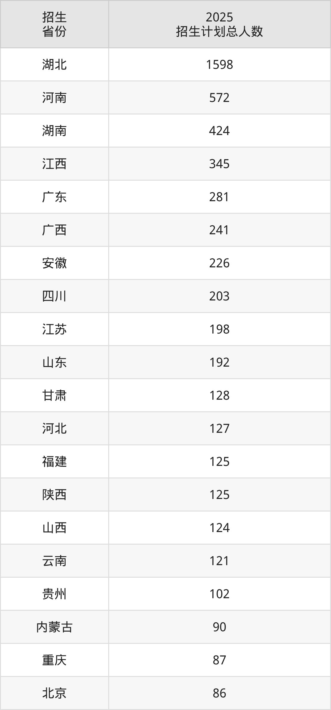 2025年武汉大学面向全国29个省市开展本科招生;招生专业共44个,招生人数共5950人。2025年在湖北省招生计划总人数是1598人,其中,武汉大学在湖北省招生人数最多的是电子信息类。武汉大学在各省具体招生人数情况如下表。