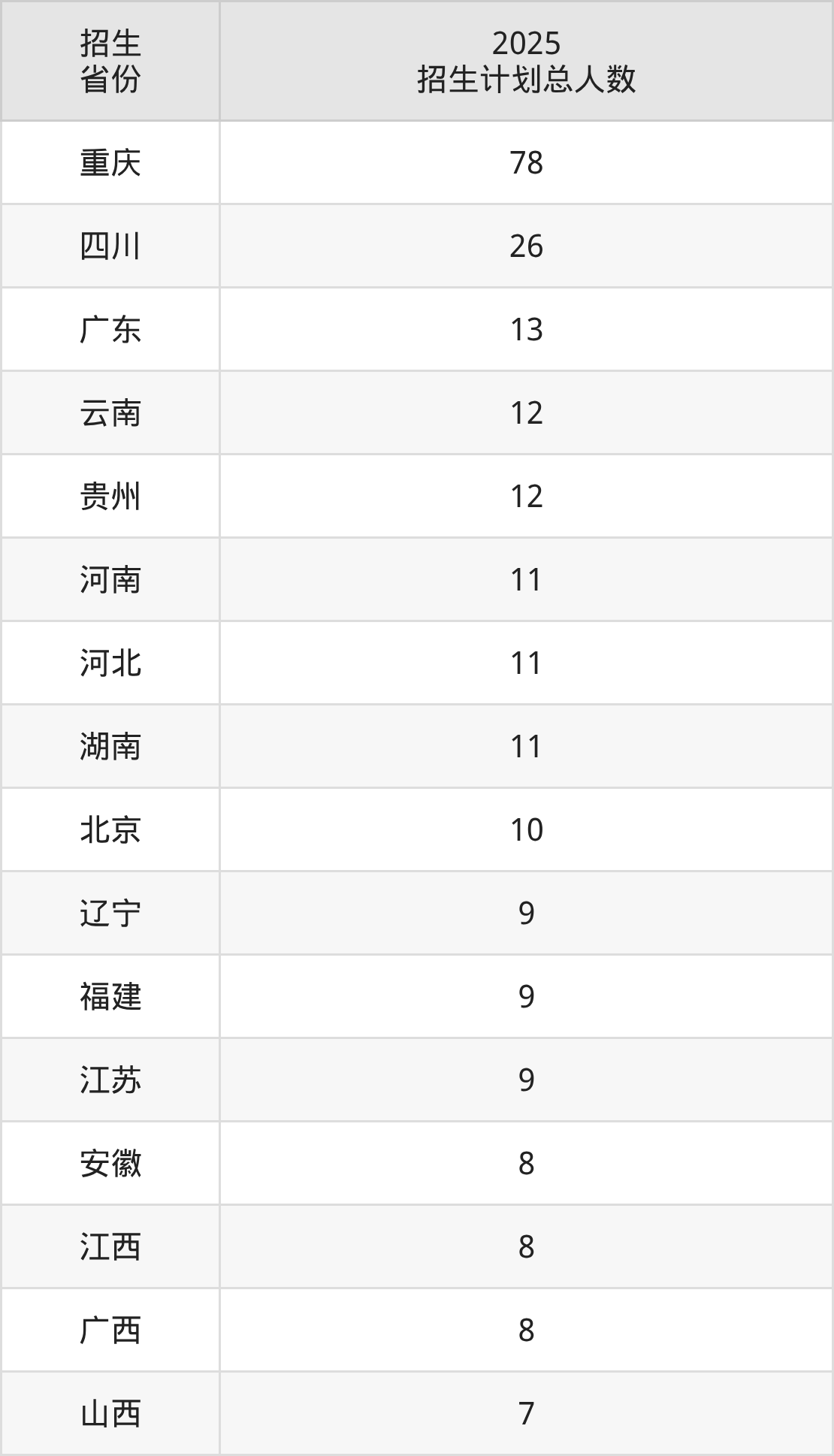 2025年四川美术学院面向全国24个省市开展本科招生;招生专业共7个,招生人数共270人。2025年在重庆市招生计划总人数是78人,其中,四川美术学院在重庆市招生人数最多的是艺术史论。四川美术学院在各省具体招生人数情况如下表。