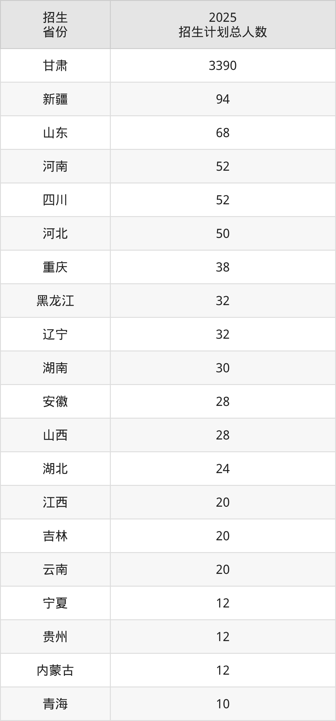 2025年河西学院面向全国20个省市开展本科招生;招生专业共54个,招生人数共4024人。2025年在甘肃省招生计划总人数是3390人,其中,河西学院在甘肃省招生人数最多的是护理学。河西学院在各省具体招生人数情况如下表。