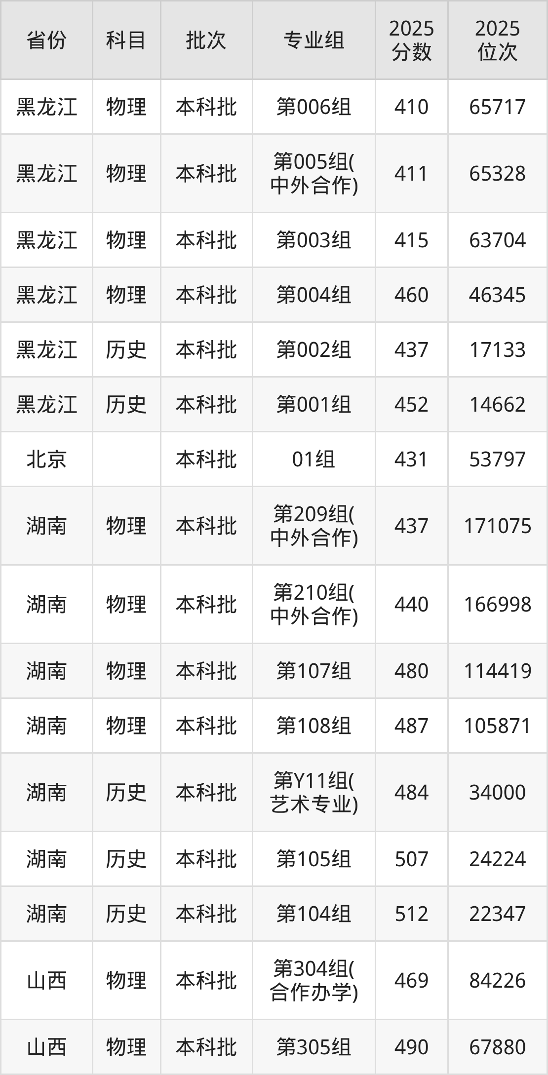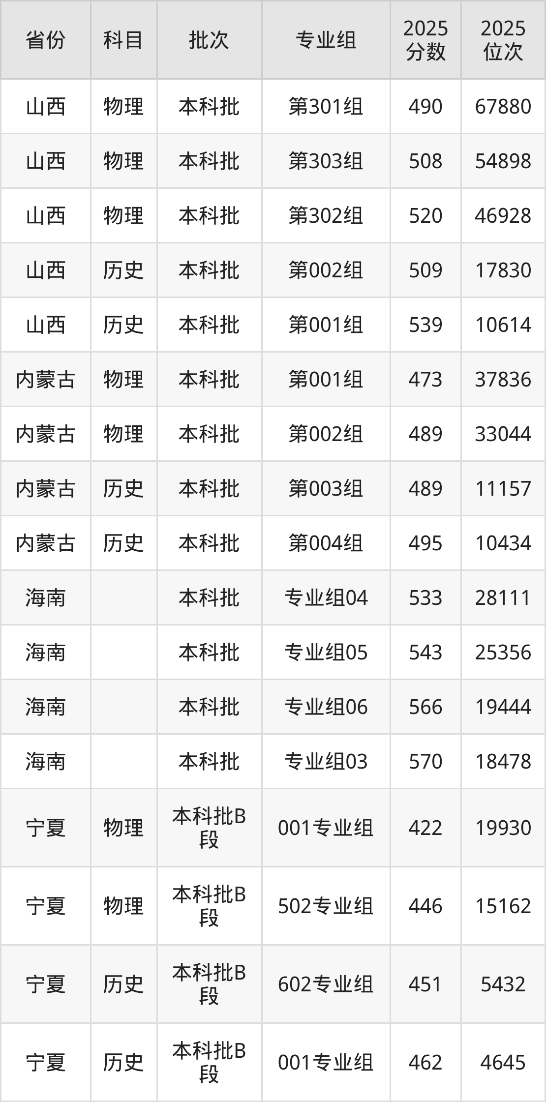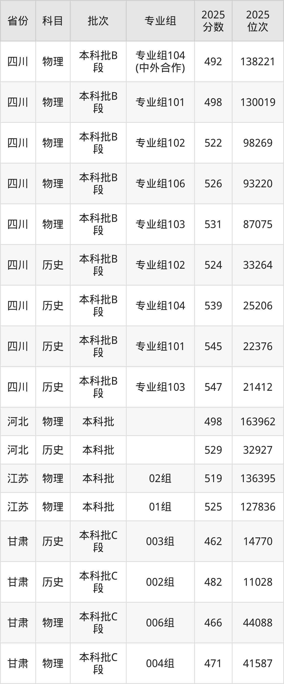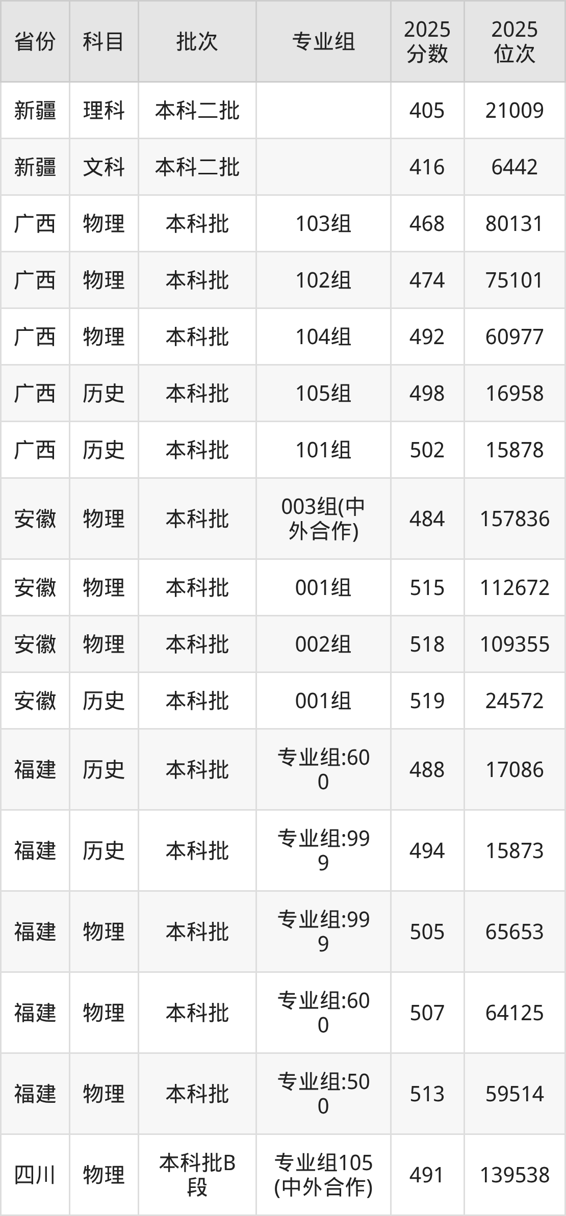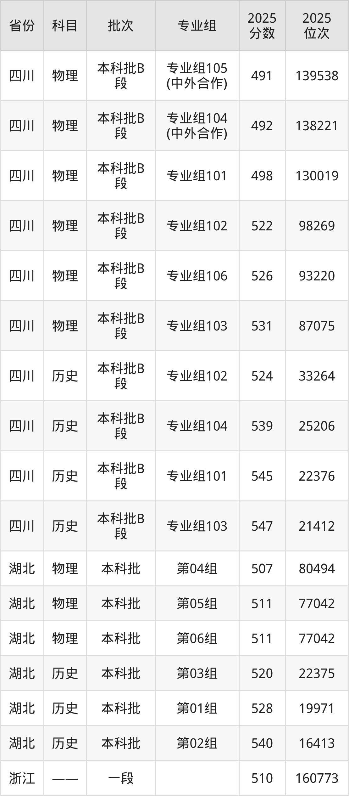 2025年在本科物理类进行招生,各专业组分数线详情如下: