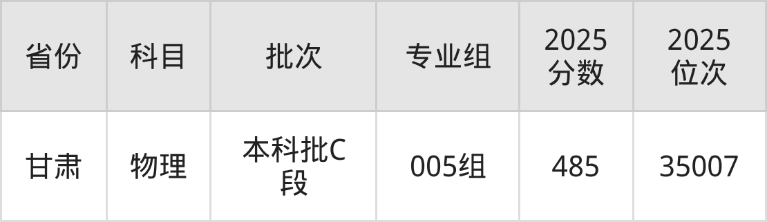 重庆文理学院005专业组:2025年投档录取最低分为485分,录取最低位次为35007名。