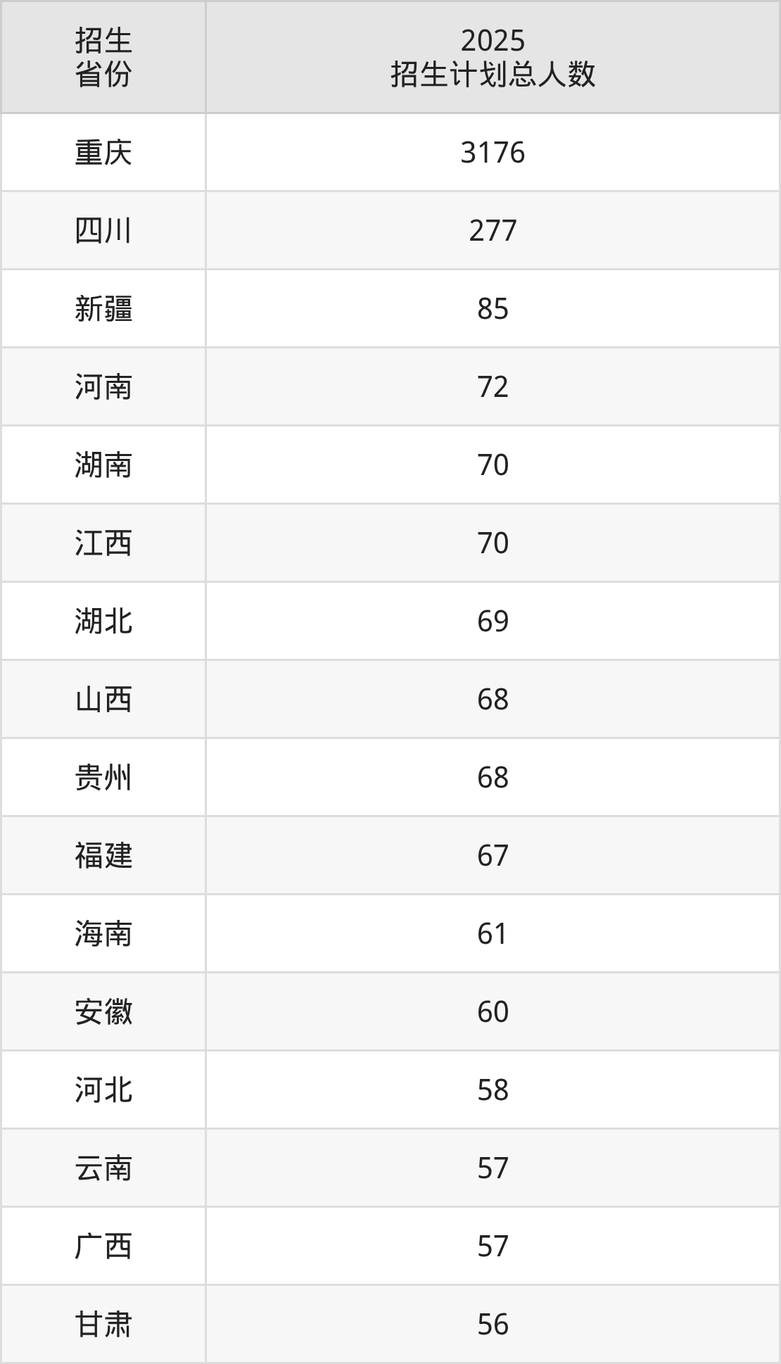 2025年重庆文理学院面向全国24个省市开展本科招生;招生专业共44个,招生人数共4600人。2025年在重庆市招生计划总人数是3176人,其中,重庆文理学院在重庆市招生人数最多的是电气工程及其自动化。重庆文理学院在各省具体招生人数情况如下表。