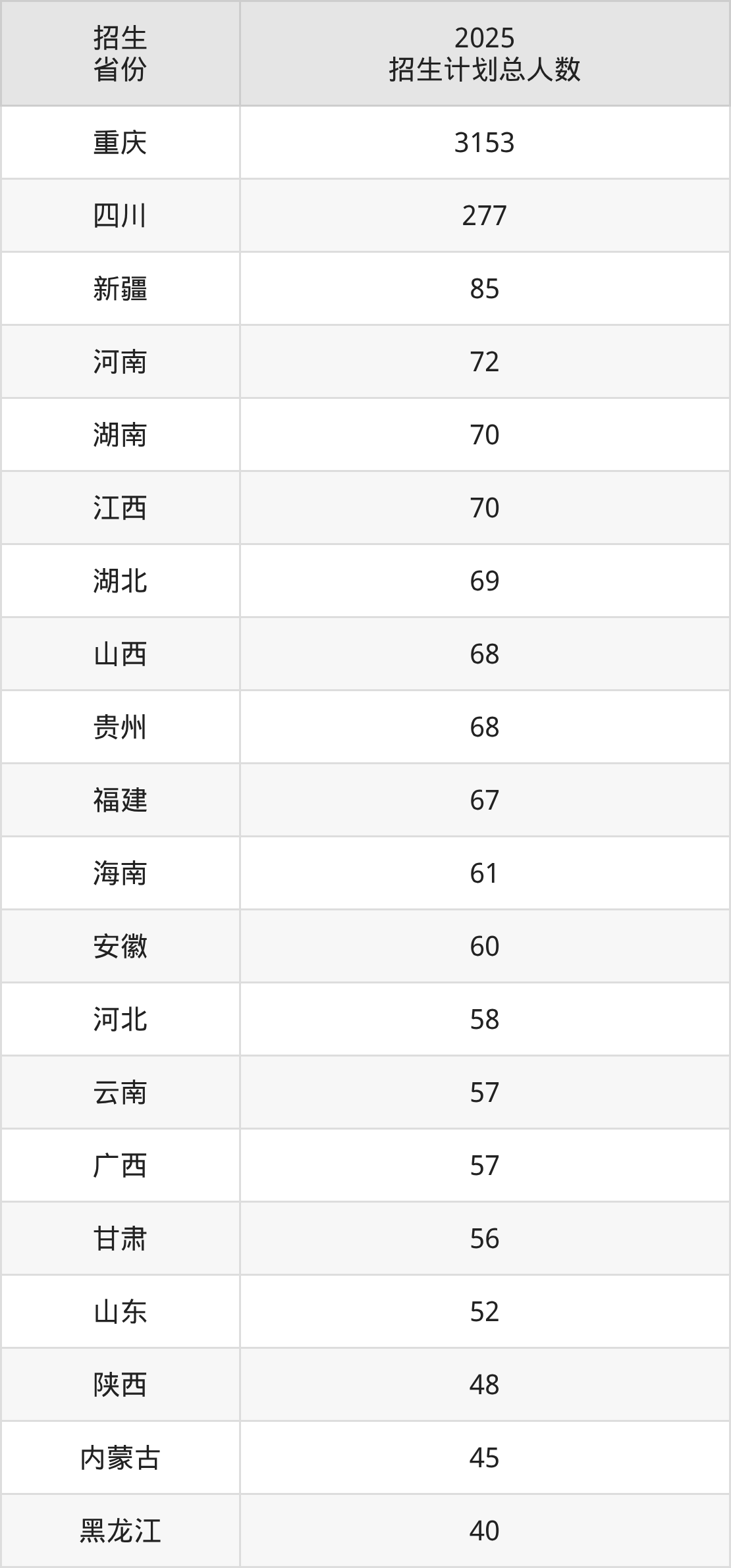 2025年重庆文理学院面向全国25个省市开展本科招生;招生专业共44个,招生人数共4629人。2025年在重庆市招生计划总人数是3153人,其中,重庆文理学院在重庆市招生人数最多的是电气工程及其自动化。重庆文理学院在各省具体招生人数情况如下表。