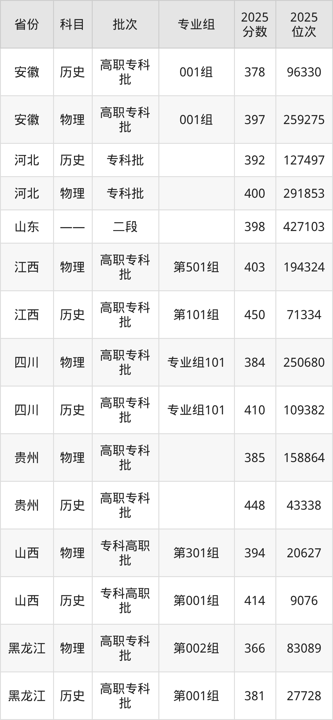 安徽国防科技职业学院001组:2025年投档录取最低分为378分,录取最低位次为96330名。