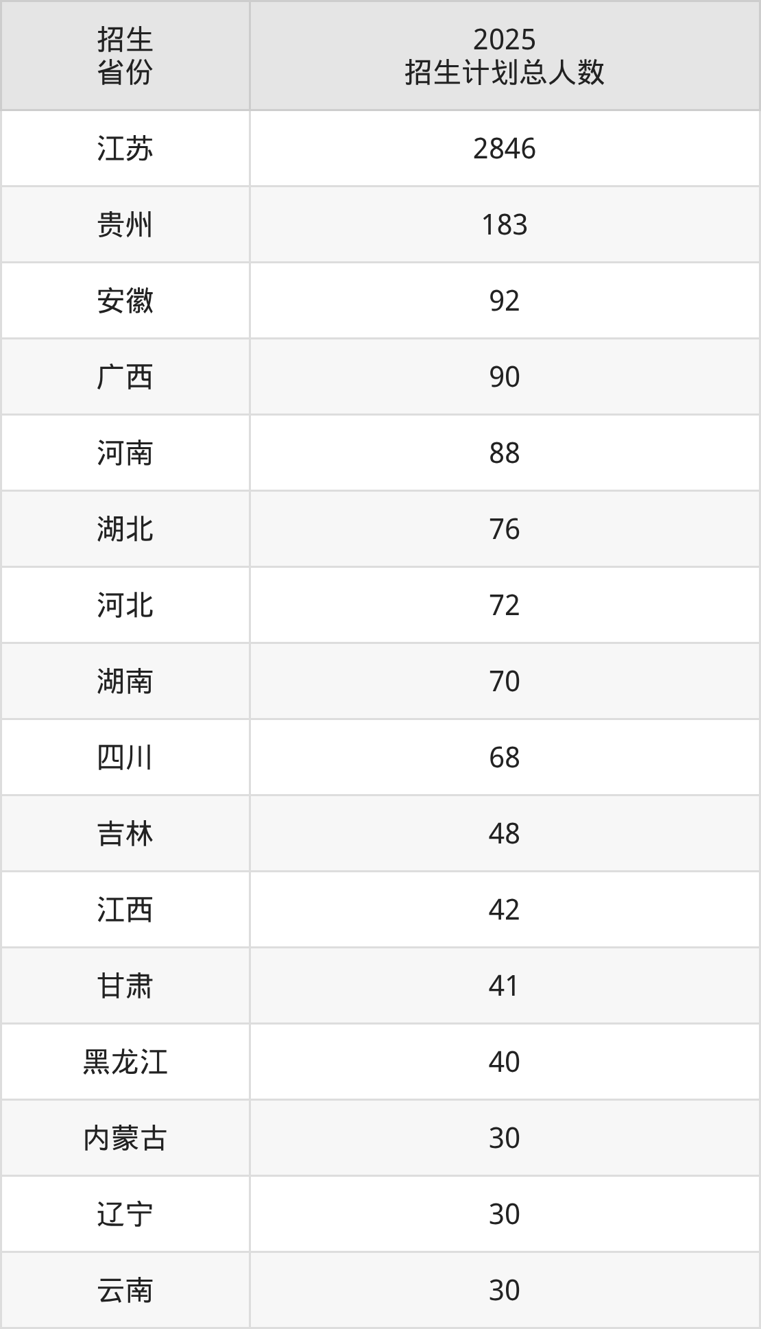 2025年江苏海洋大学面向全国25个省市开展本科招生;招生专业共58个,招生人数共4027人。2025年在江苏省招生计划总人数是2846人,其中,江苏海洋大学在江苏省招生人数最多的是机械设计制造及其自动化。江苏海洋大学在各省具体招生人数情况如下表。