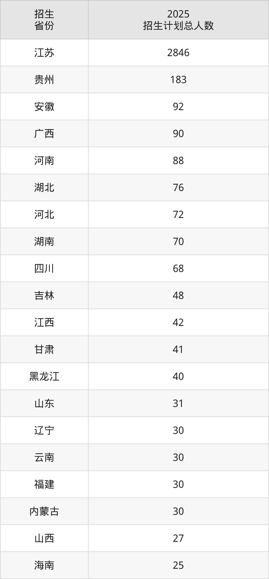 2025年江苏海洋大学面向全国26个省市开展本科招生;招生专业共58个,招生人数共4058人。2025年在江苏省招生计划总人数是2846人,其中,江苏海洋大学在江苏省招生人数最多的是机械设计制造及其自动化。江苏海洋大学在各省具体招生人数情况如下表。