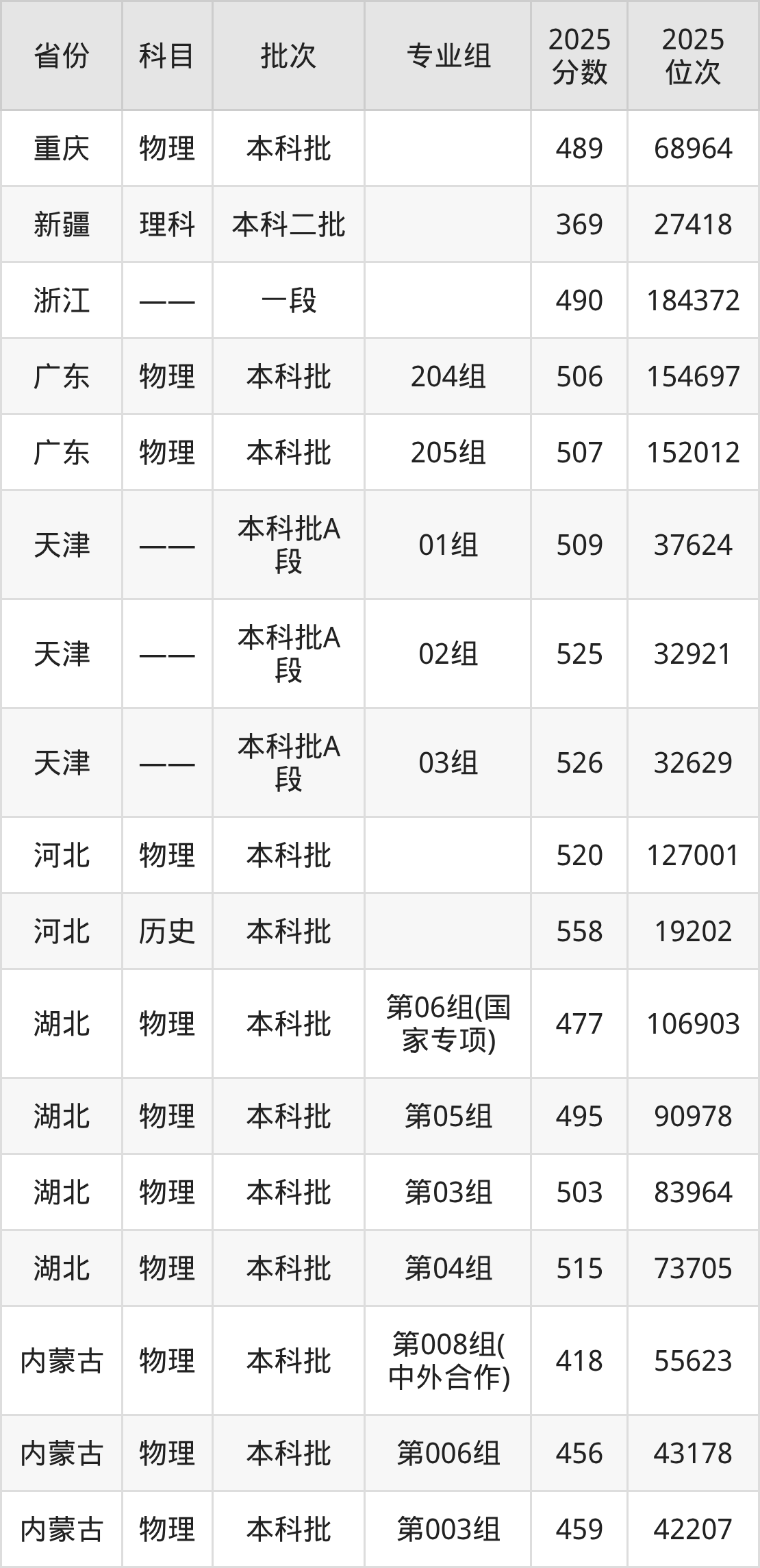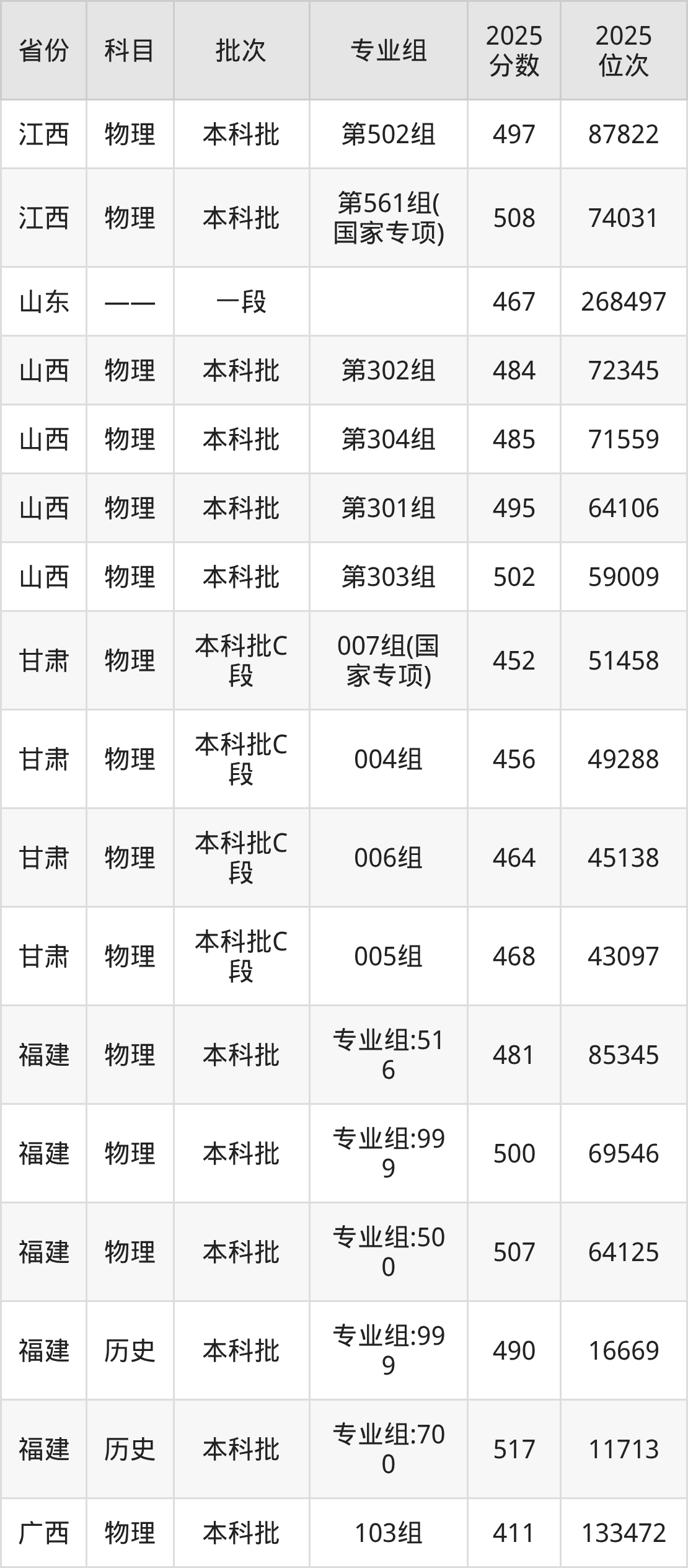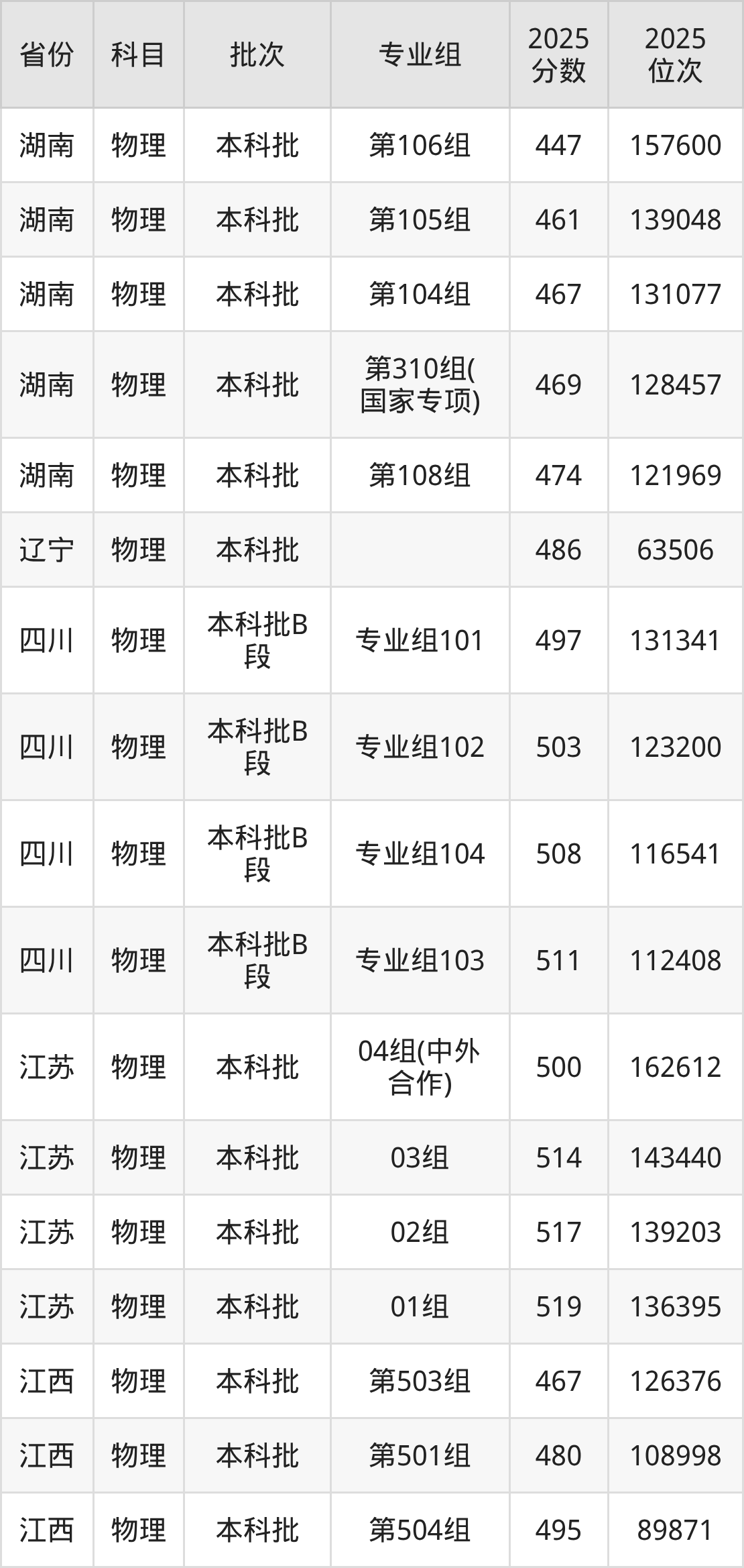 2025年在本科物理类进行招生,各专业组分数线详情如下:
