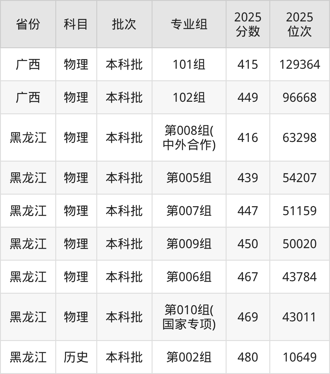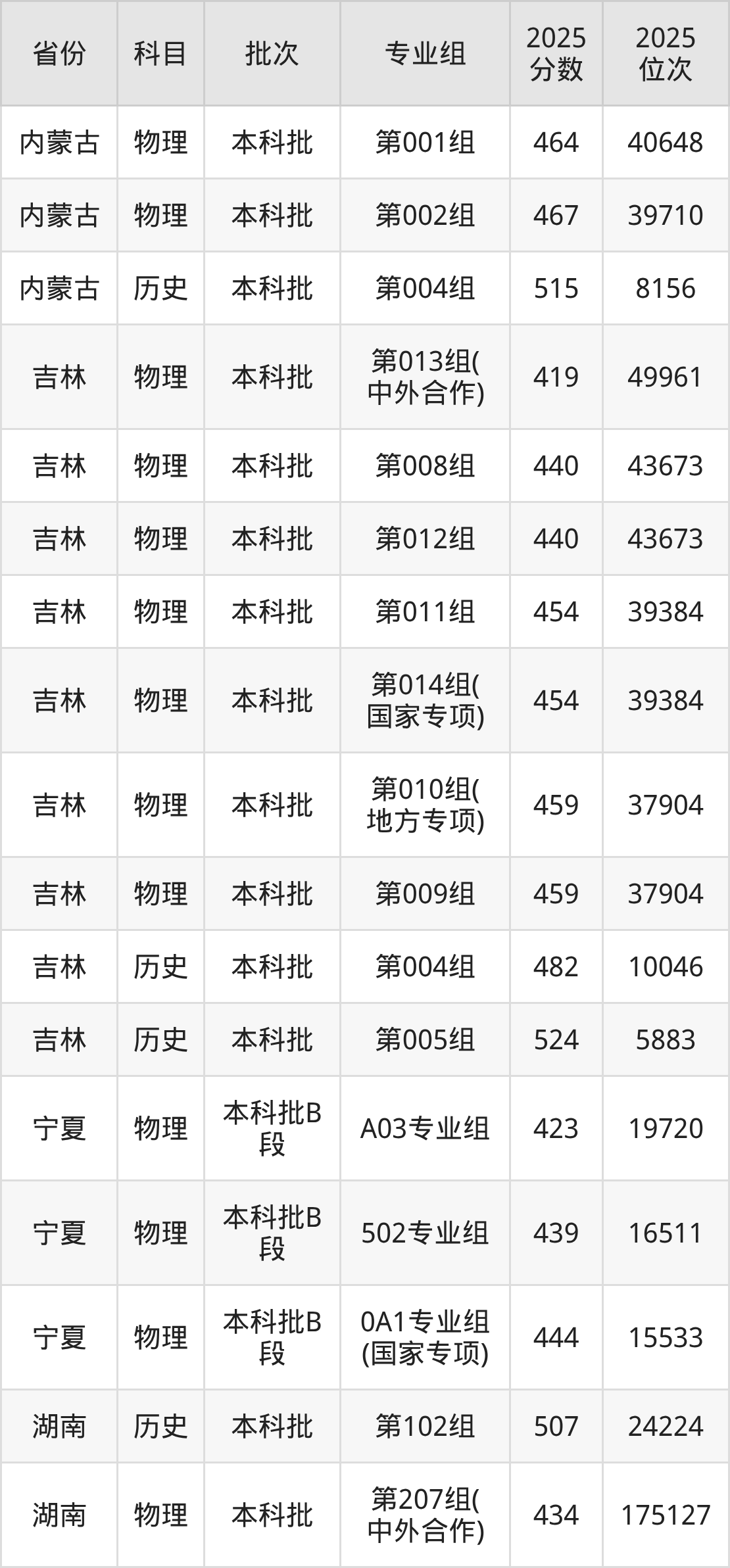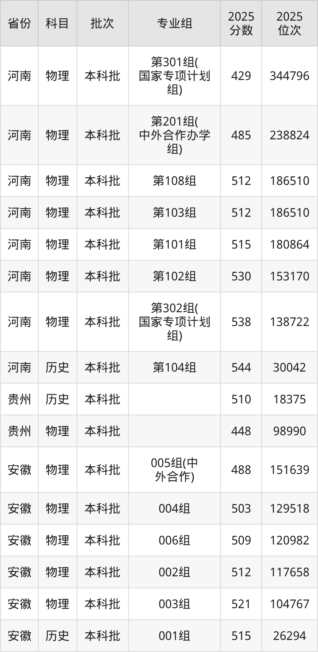 2025年在本科物理类进行招生,各专业组分数线详情如下: