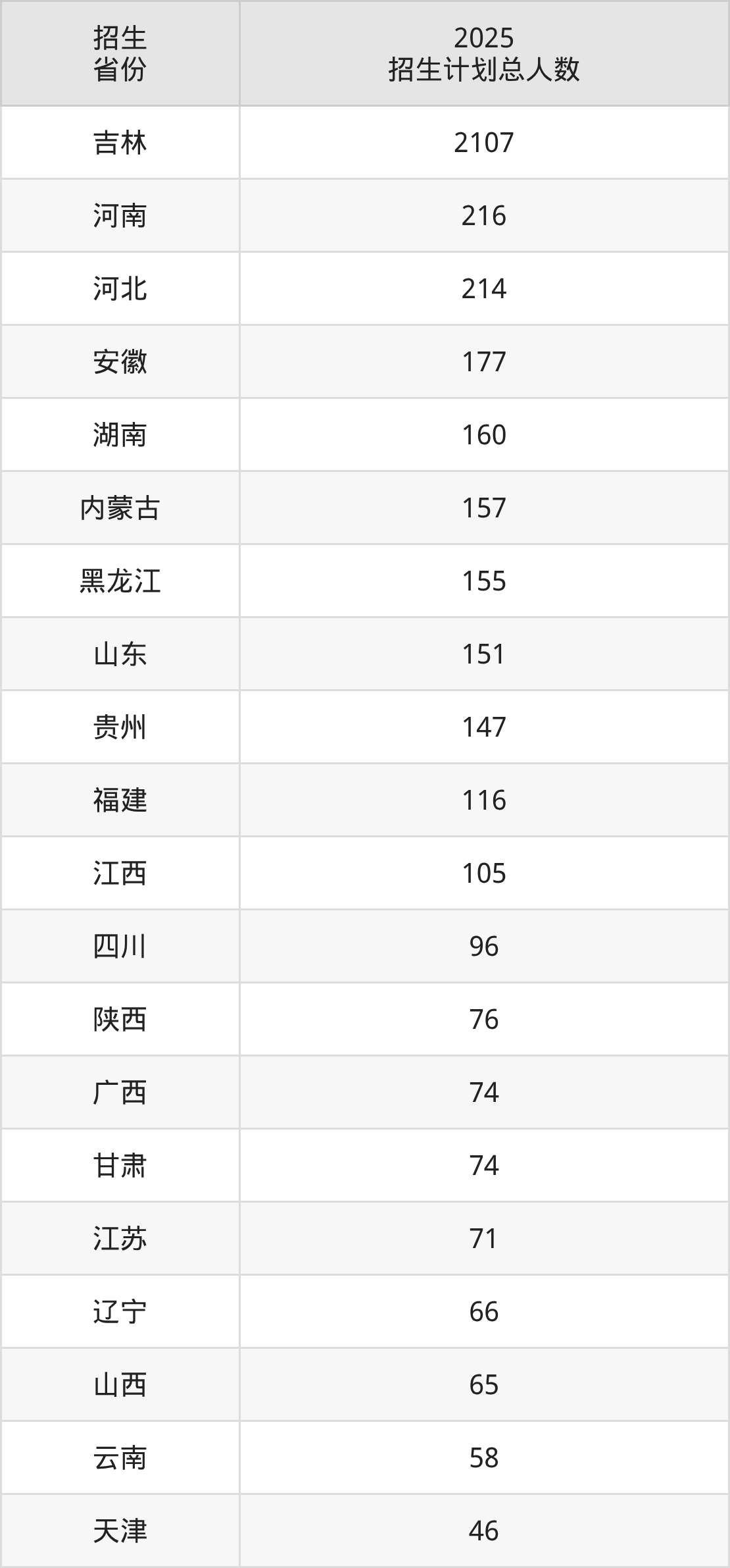2025年吉林农业大学面向全国26个省市开展本科招生;招生专业共31个,招生人数共4468人。2025年在吉林省招生计划总人数是2107人,其中,吉林农业大学在吉林省招生人数最多的是计算机类。吉林农业大学在各省具体招生人数情况如下表。