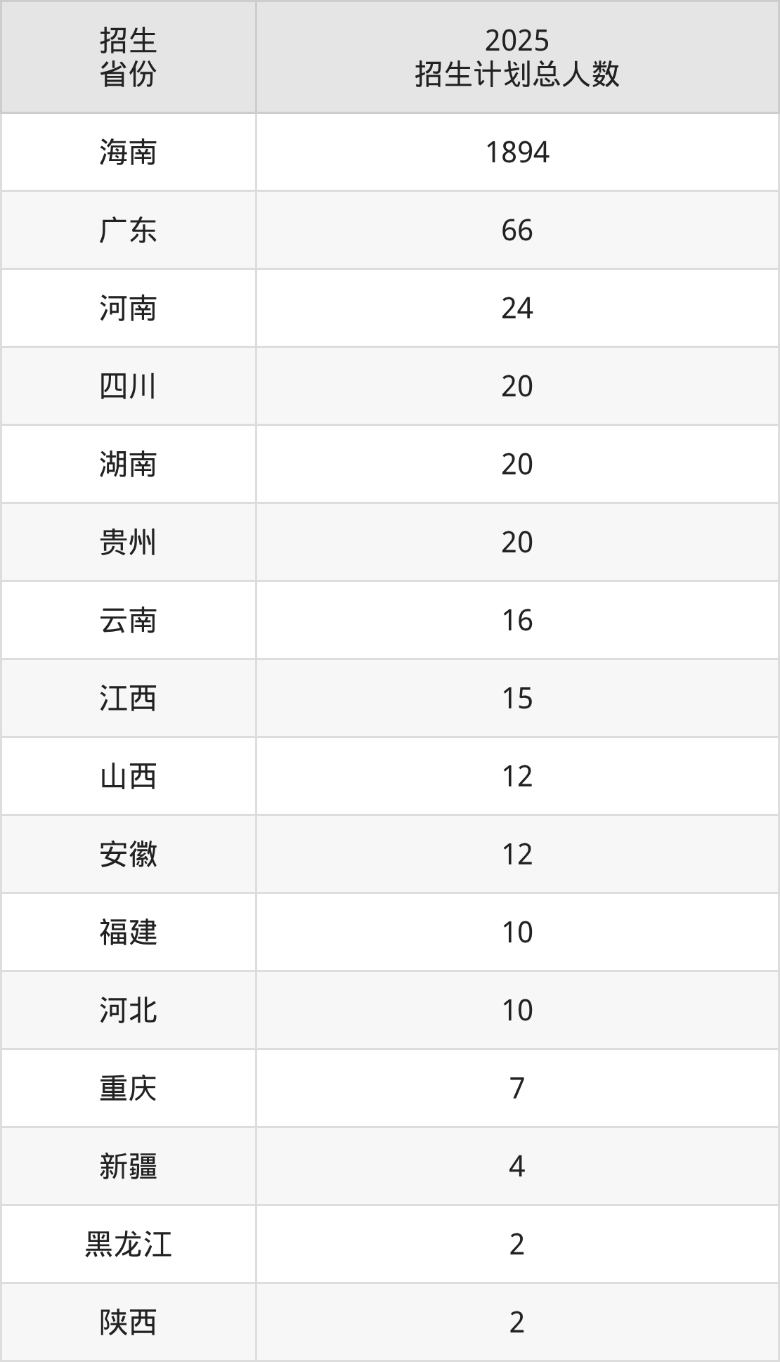 2025年海南外国语职业学院面向全国18个省市开展专科招生;招生专业共30个,招生人数共2138人。2025年在海南省招生计划总人数是1894人,其中,海南外国语职业学院在海南省招生人数最多的是应用英语。海南外国语职业学院在各省具体招生人数情况如下表。