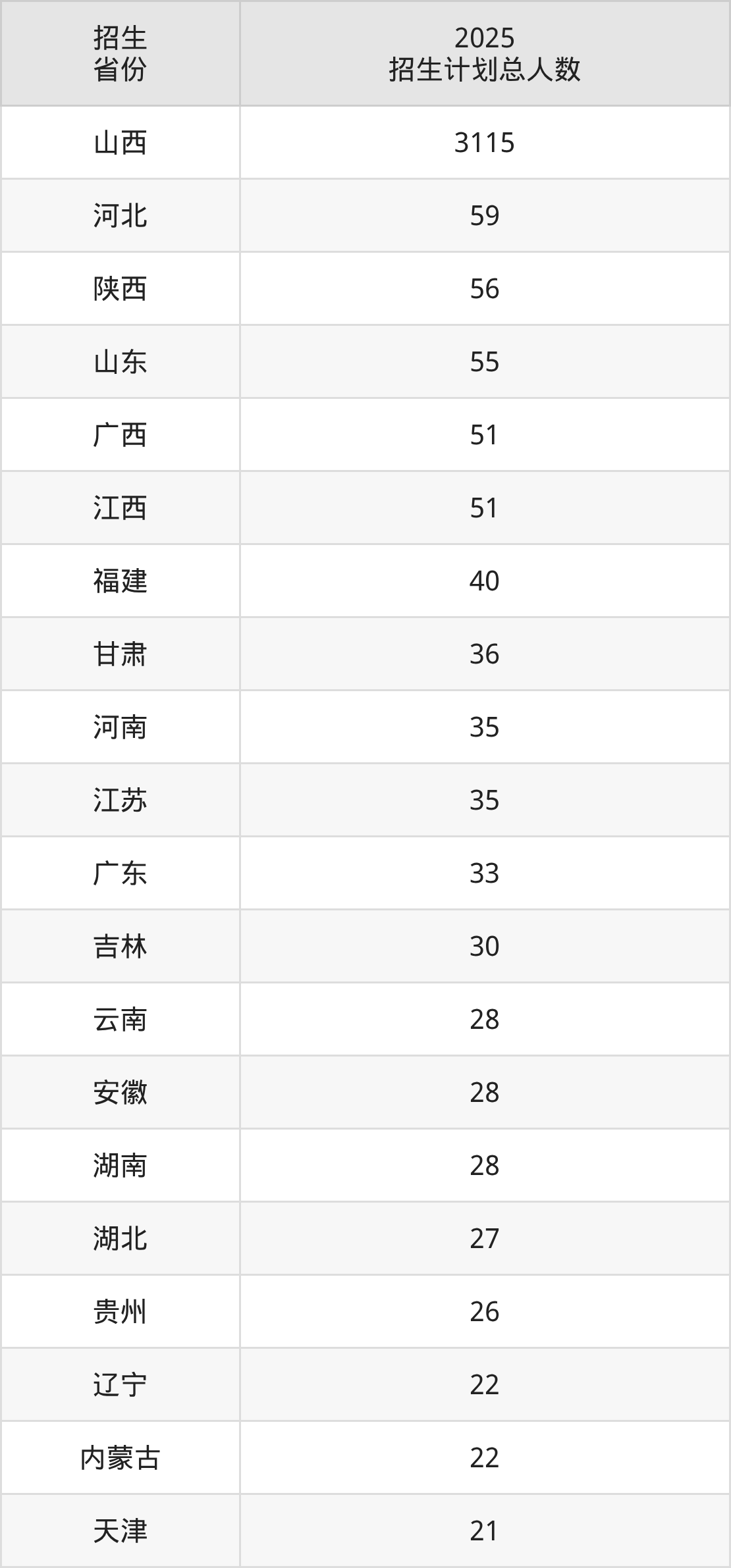 2025年山西师范大学面向全国25个省市开展本科招生;招生专业共43个,招生人数共3876人。2025年在山西省招生计划总人数是3115人,其中,山西师范大学在山西省招生人数最多的是物理学。山西师范大学在各省具体招生人数情况如下表。