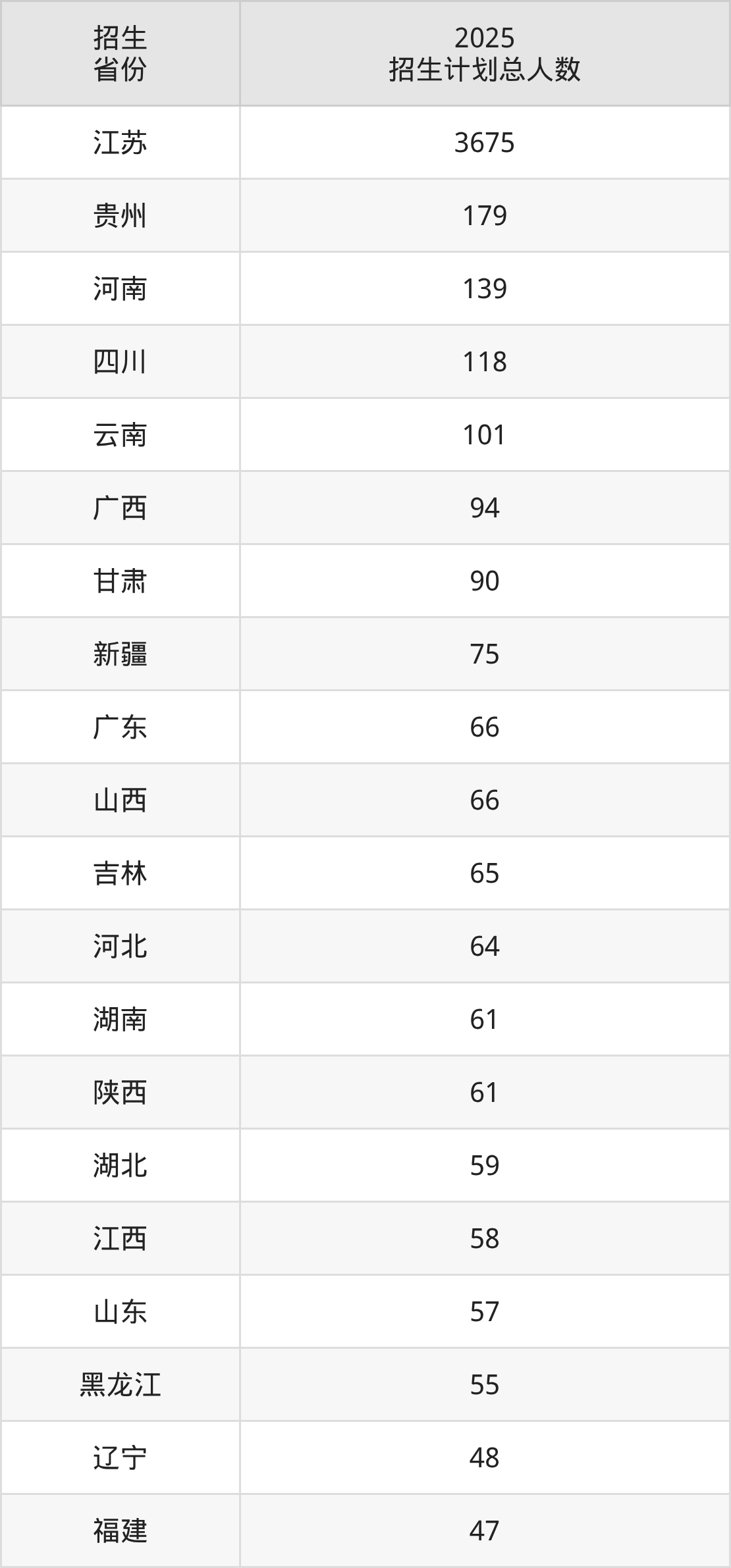 2025年苏州大学面向全国29个省市开展本科招生;招生专业共83个,招生人数共5472人。2025年在江苏省招生计划总人数是3675人,其中,苏州大学在江苏省招生人数最多的是软件工程。苏州大学在各省具体招生人数情况如下表。
