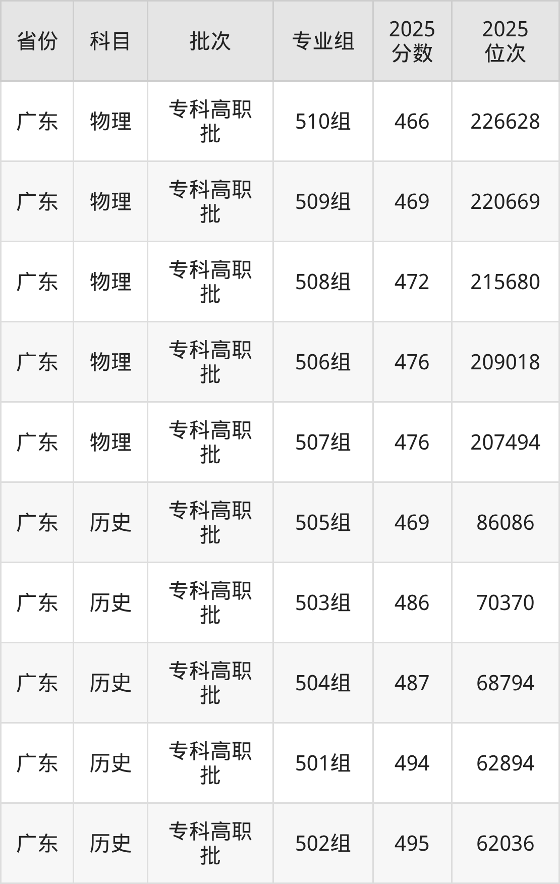 普通类专科物理类最低466分,专科历史类最低469分