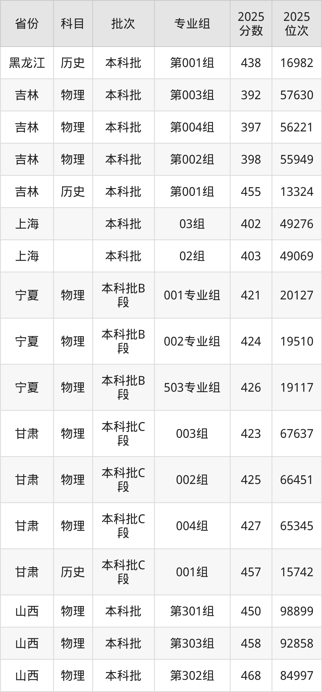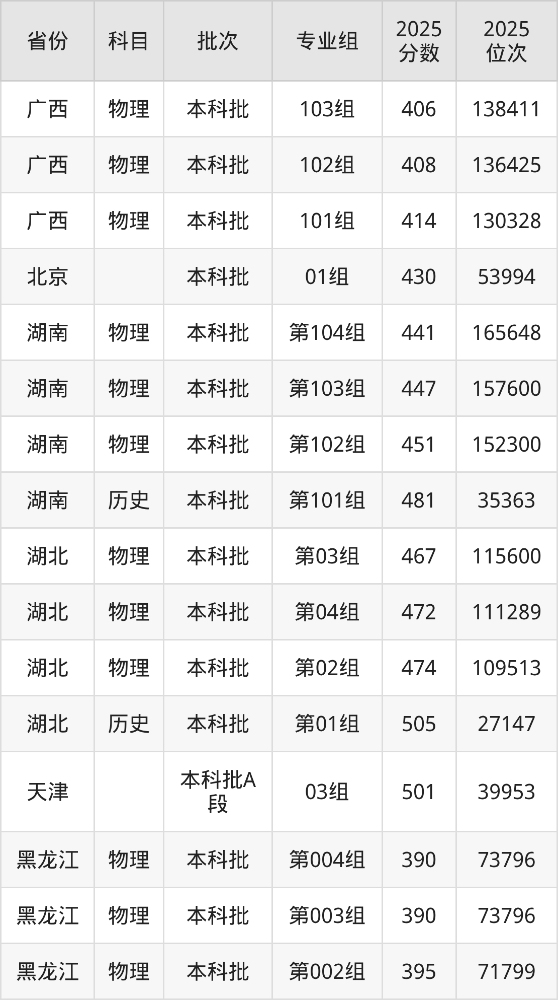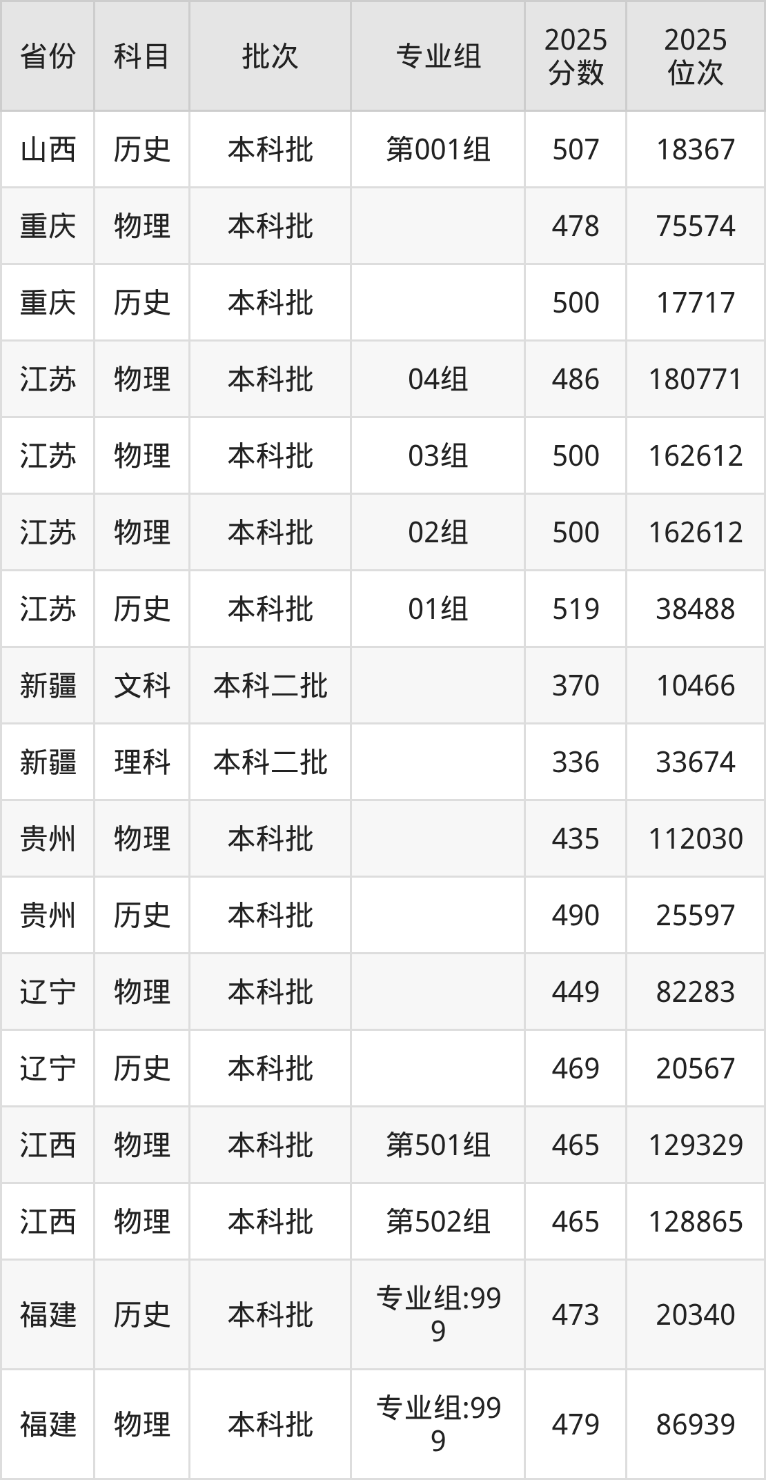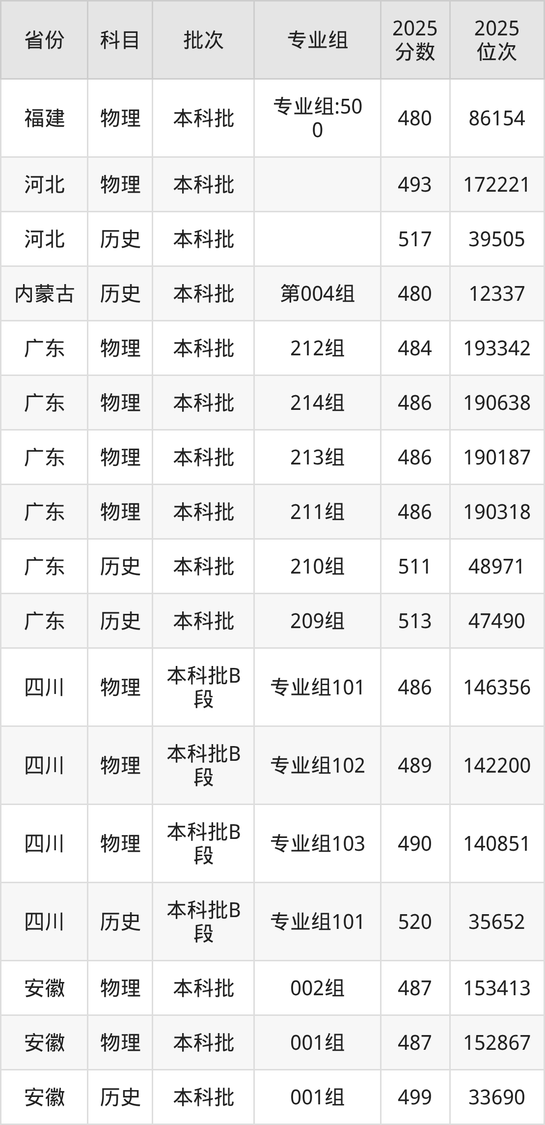2025年在本科物理类进行招生,各专业组分数线详情如下: