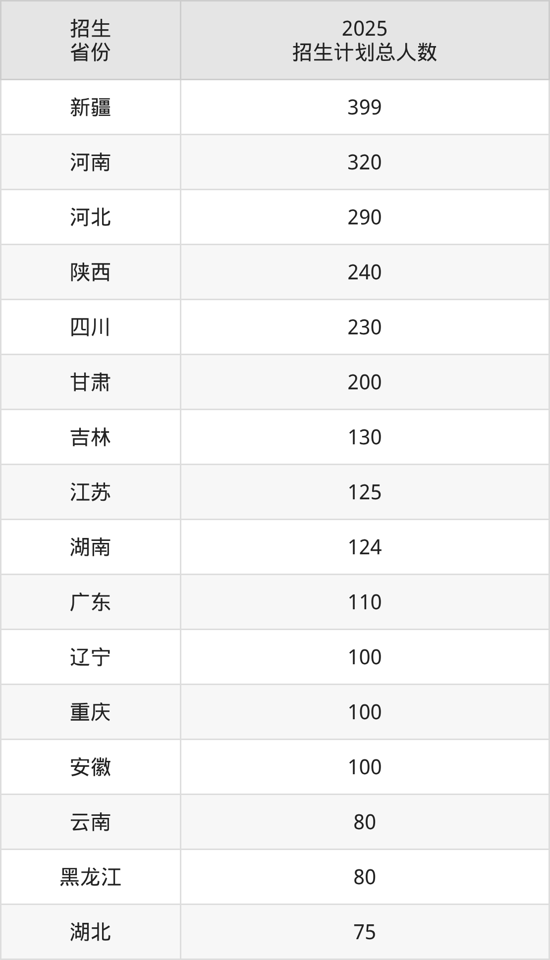 2025年新疆理工学院面向全国28个省市开展本科招生;招生专业共41个,招生人数共3025人。2025年在新疆维吾尔自治区招生计划总人数是399人,其中,新疆理工学院在新疆维吾尔自治区招生人数最多的是中国少数民族语言文学。新疆理工学院在各省具体招生人数情况如下表。