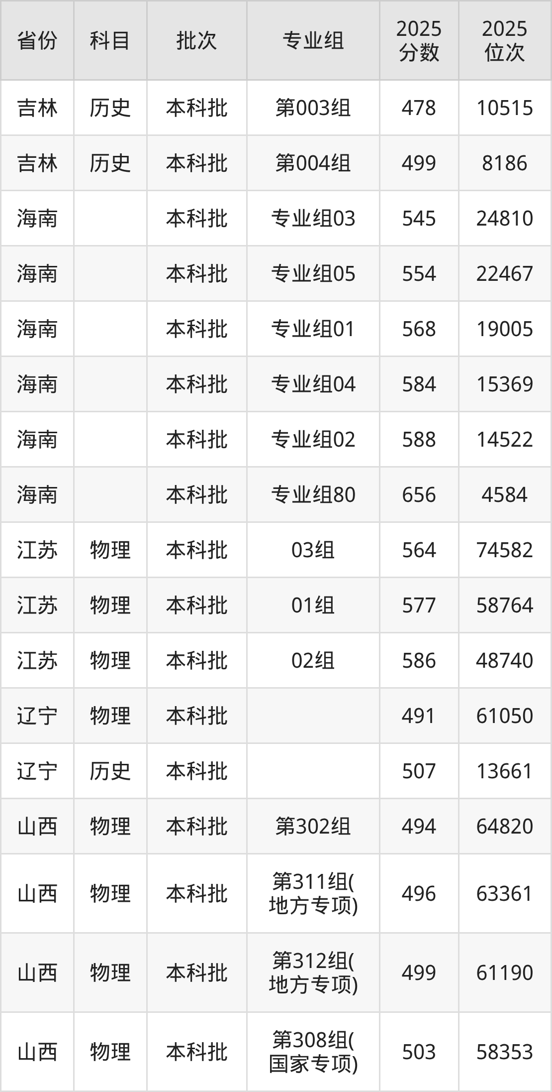 山西医科大学第312组(地方专项计划):2025年投档录取最低分为499分,录取最低位次为61190名。