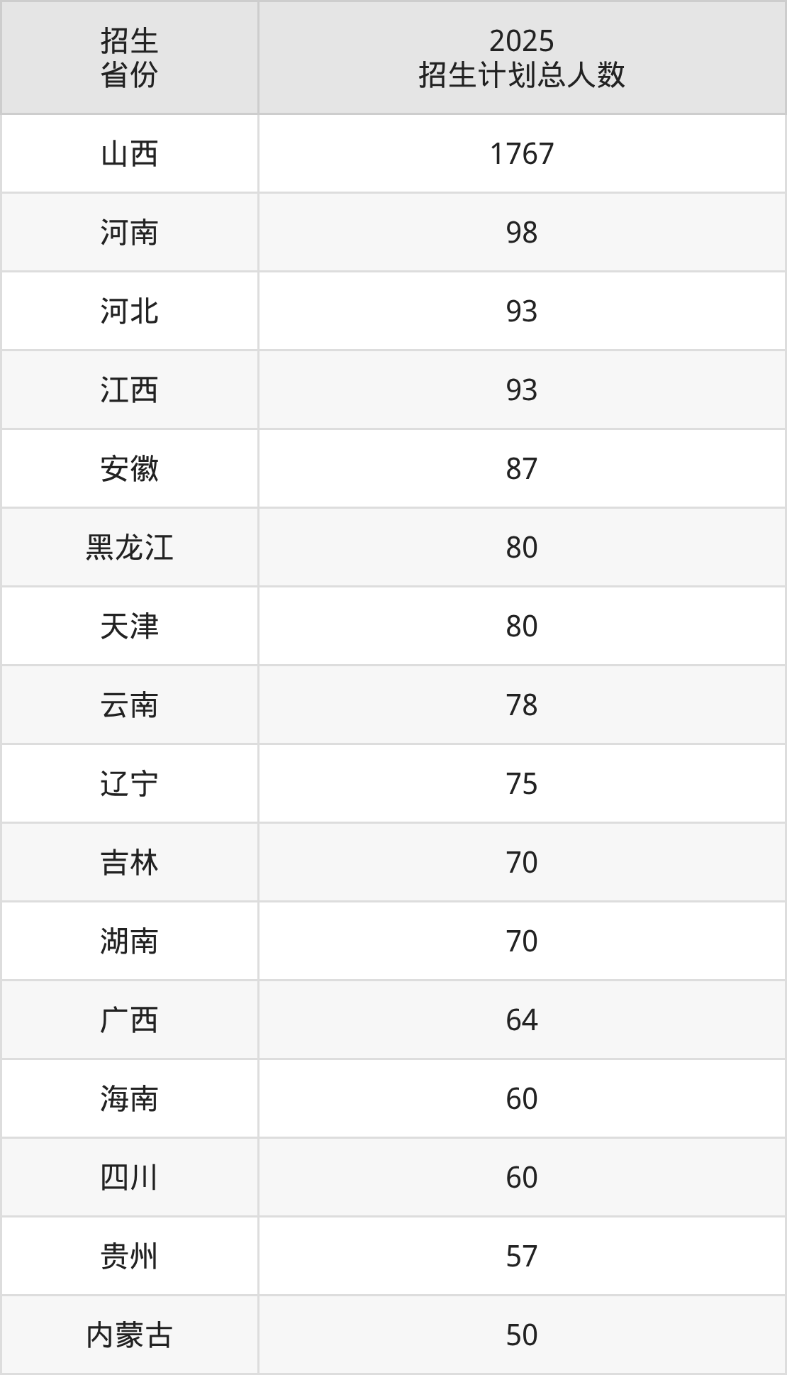 2025年山西医科大学面向全国27个省市开展本科招生;招生专业共28个,招生人数共3259人。2025年在山西省招生计划总人数是1767人,其中,山西医科大学在山西省招生人数最多的是临床医学。山西医科大学在各省具体招生人数情况如下表。