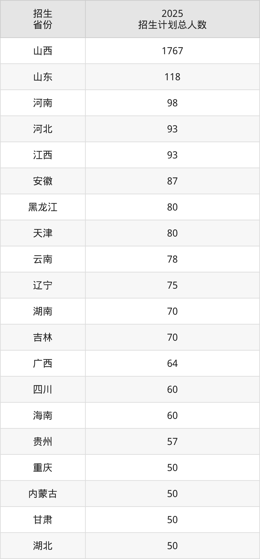 2025年山西医科大学面向全国28个省市开展本科招生;招生专业共28个,招生人数共3377人。2025年在山西省招生计划总人数是1767人,其中,山西医科大学在山西省招生人数最多的是临床医学。山西医科大学在各省具体招生人数情况如下表。