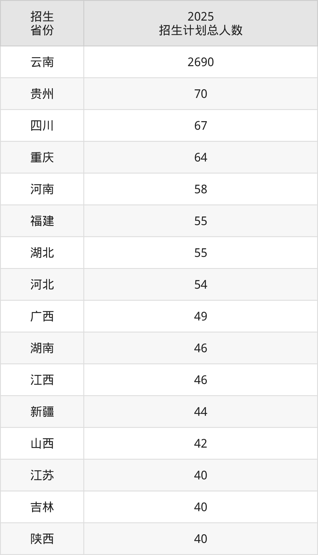 2025年大理大学面向全国28个省市开展本科招生;招生专业共42个,招生人数共3649人。2025年在云南省招生计划总人数是2690人,其中,大理大学在云南省招生人数最多的是临床医学。大理大学在各省具体招生人数情况如下表。