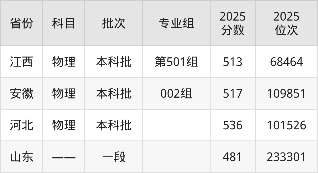 2025年在本科物理类进行招生,各专业组分数线详情如下: