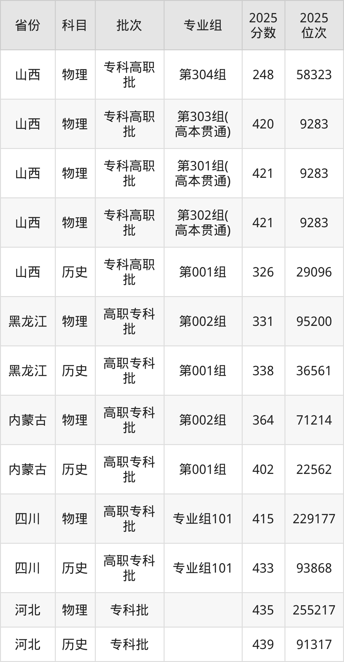 山西机电职业技术学院第303组(高本贯通):2025年投档录取最低分为420分,录取最低位次为9283名。