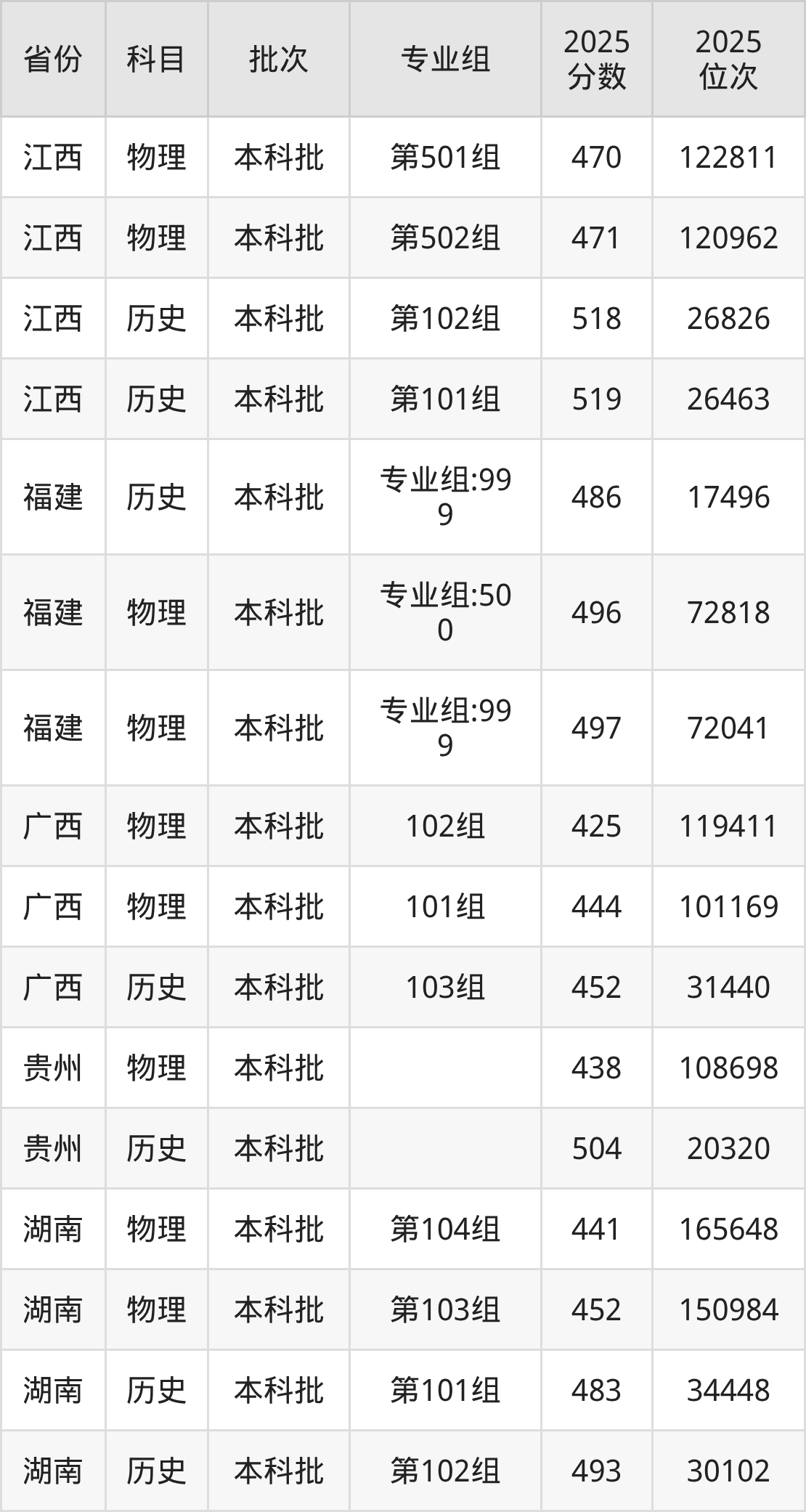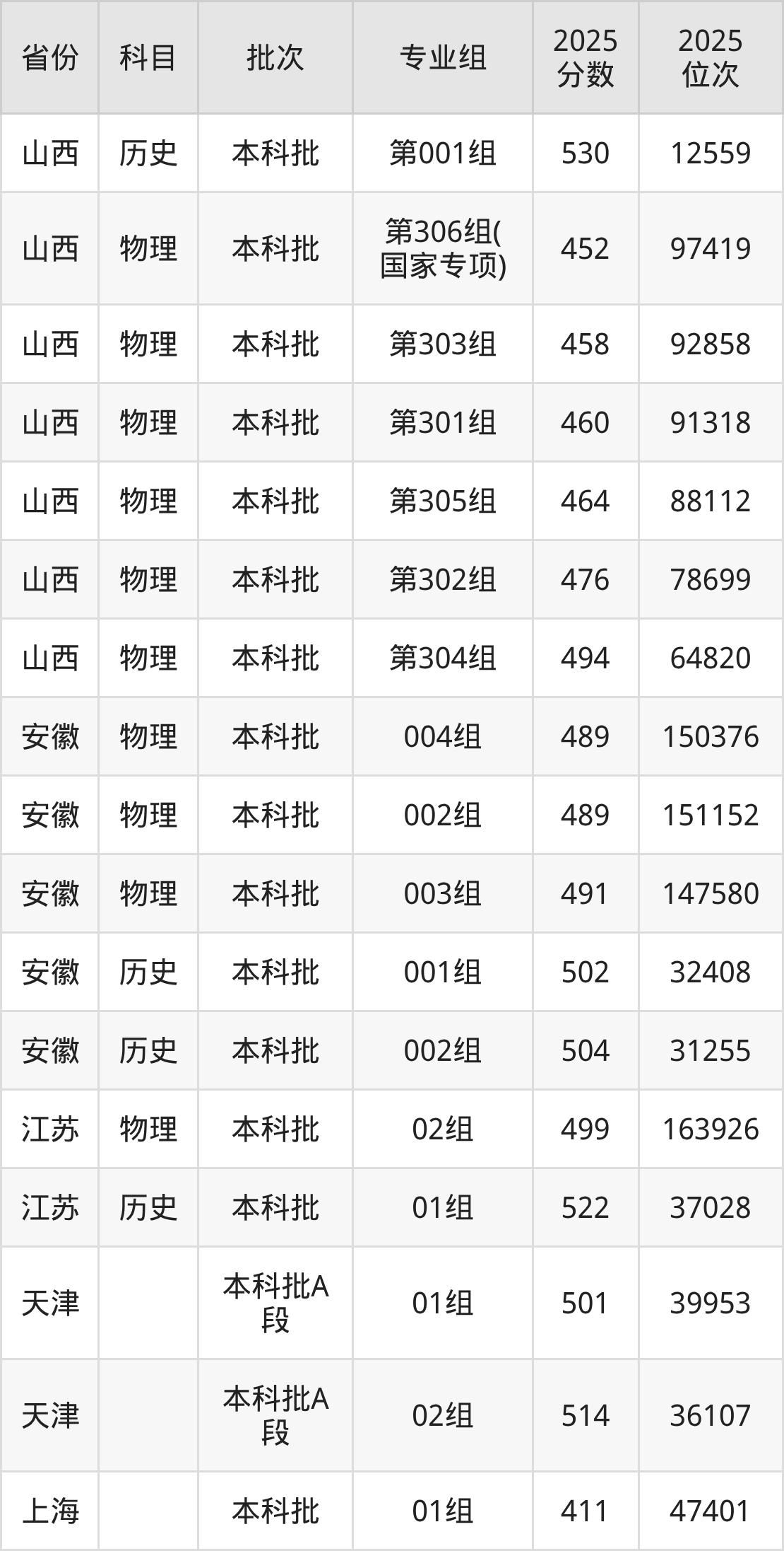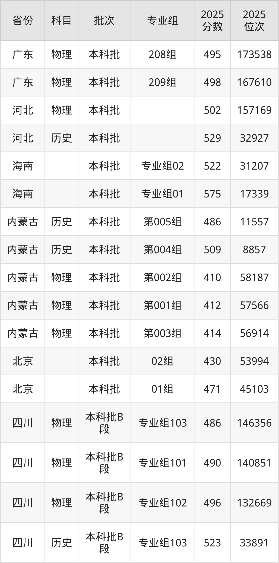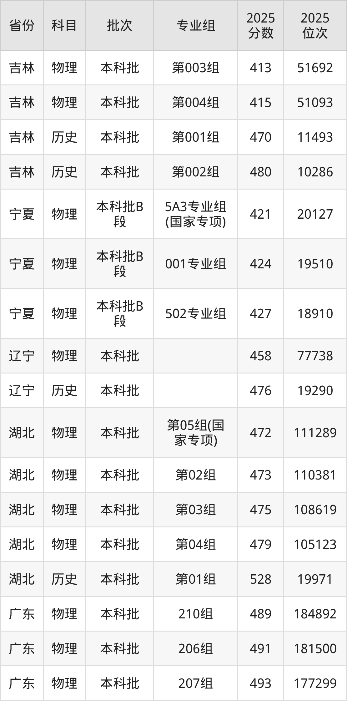 2025年在本科物理类进行招生,各专业组分数线详情如下: