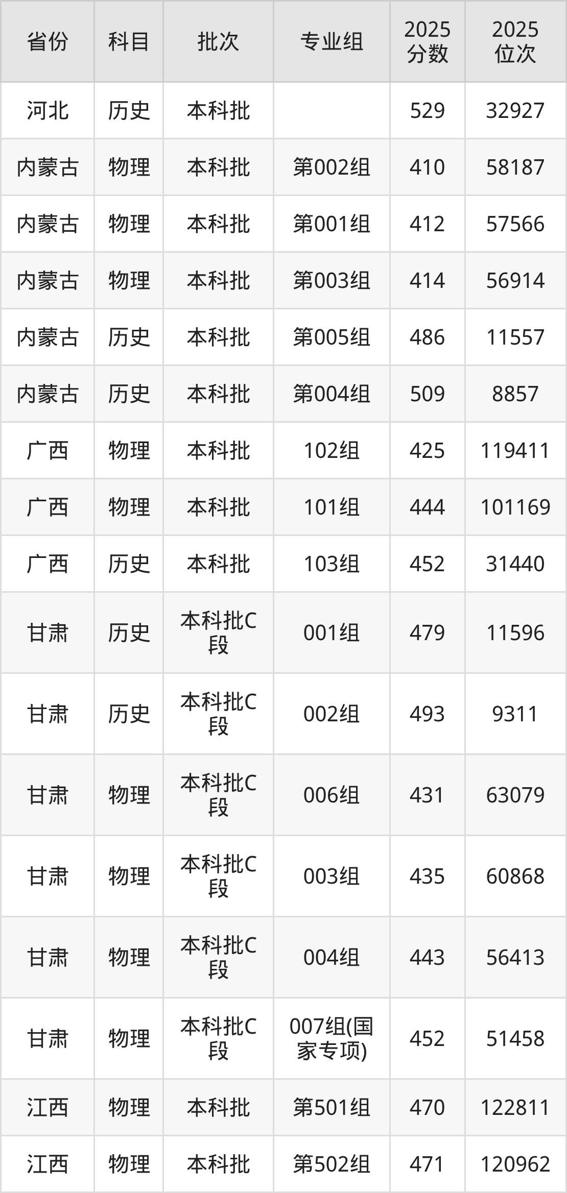 普通类本科物理类最低425分,本科历史类最低452分