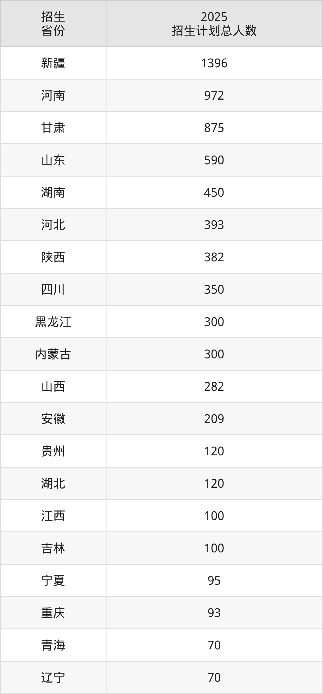 2025年塔里木大学面向全国29个省市开展本科招生;招生专业共85个,招生人数共7573人。2025年在新疆维吾尔自治区招生计划总人数是1396人,其中,塔里木大学在新疆维吾尔自治区招生人数最多的是工商管理类。塔里木大学在各省具体招生人数情况如下表。