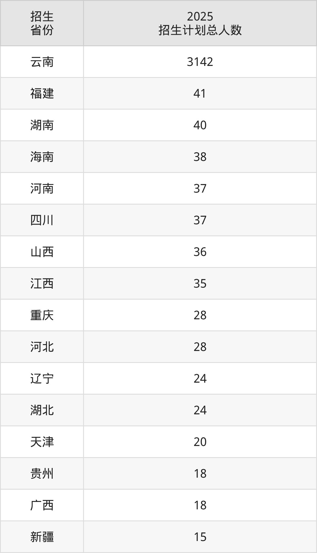 2025年曲靖师范学院面向全国23个省市开展本科招生;招生专业共39个,招生人数共3620人。2025年在云南省招生计划总人数是3142人,其中,曲靖师范学院在云南省招生人数最多的是化学。曲靖师范学院在各省具体招生人数情况如下表。