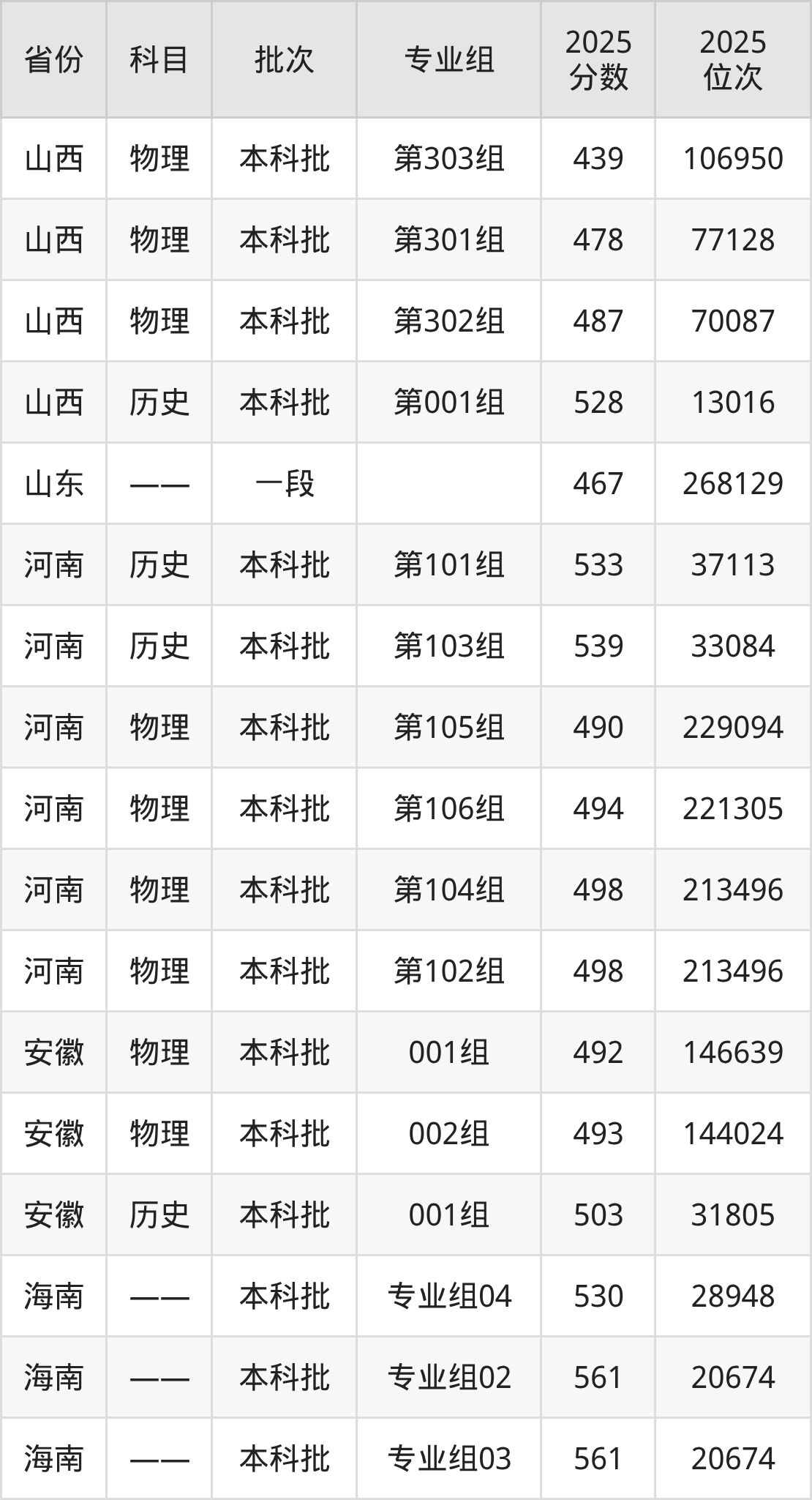普通类本科物理类最低439分,本科历史类最低528分