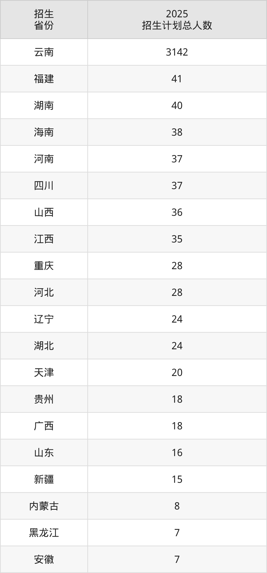 2025年曲靖师范学院面向全国24个省市开展本科招生;招生专业共39个,招生人数共3636人。2025年在云南省招生计划总人数是3142人,其中,曲靖师范学院在云南省招生人数最多的是化学。曲靖师范学院在各省具体招生人数情况如下表。