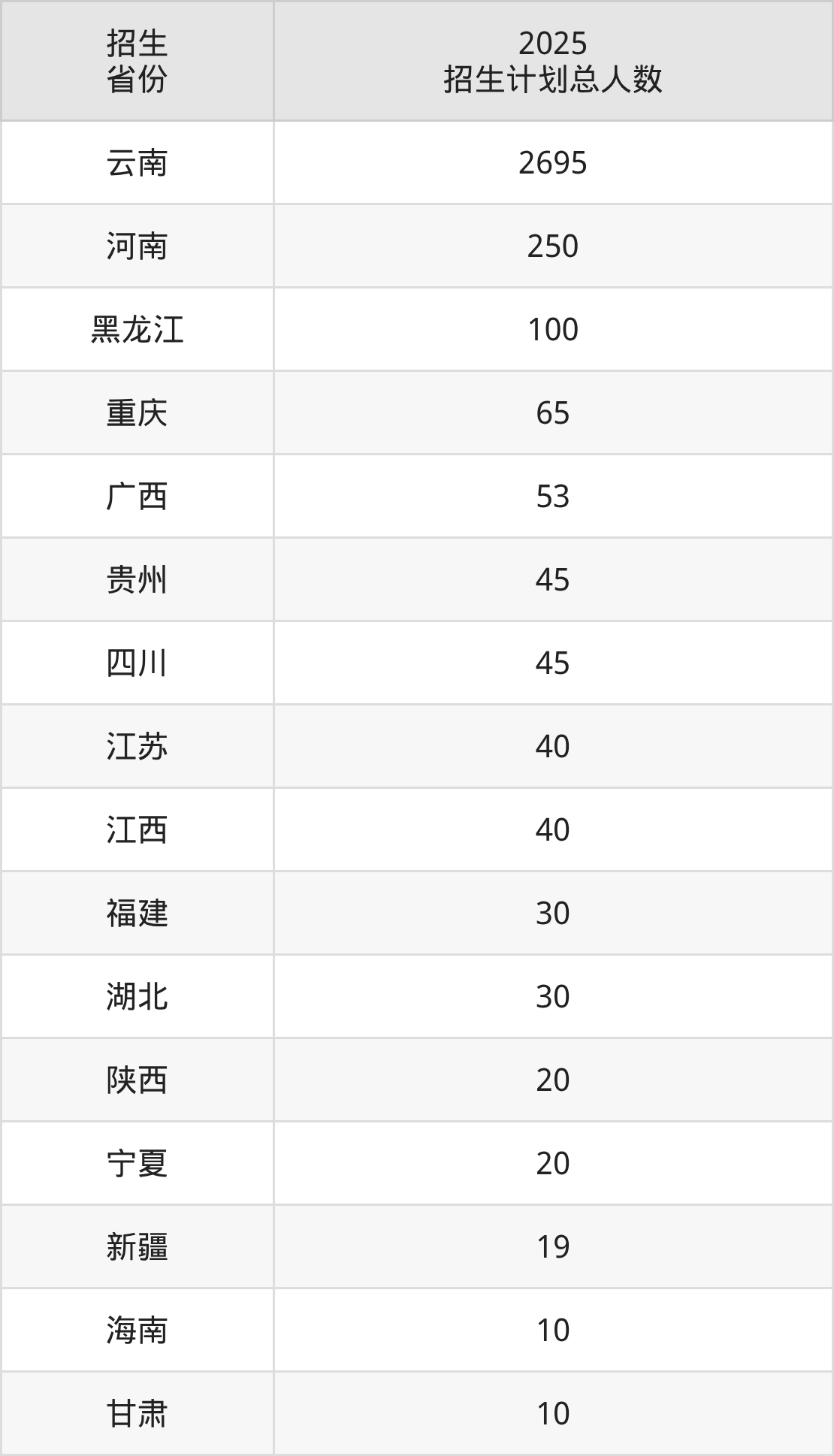 2025年云南工商学院面向全国16个省市开展本科招生;招生专业共27个,招生人数共2491人。2025年在云南省招生计划总人数是2695人,其中,云南工商学院在云南省招生人数最多的是汉语言文学。云南工商学院在各省具体招生人数情况如下表。