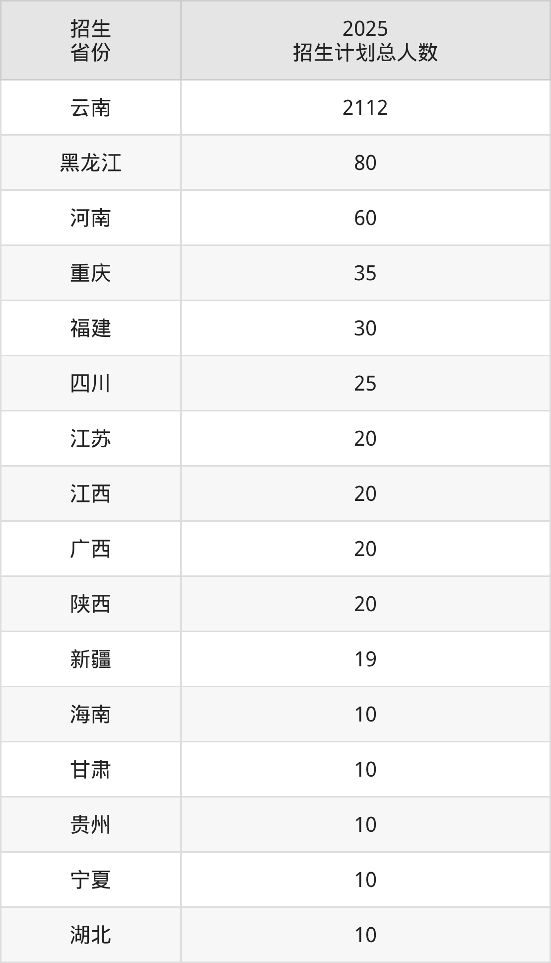 2025年云南工商学院面向全国16个省市开展本科招生;招生专业共27个,招生人数共2491人。2025年在云南省招生计划总人数是2112人,其中,云南工商学院在云南省招生人数最多的是汉语言文学。云南工商学院在各省具体招生人数情况如下表。